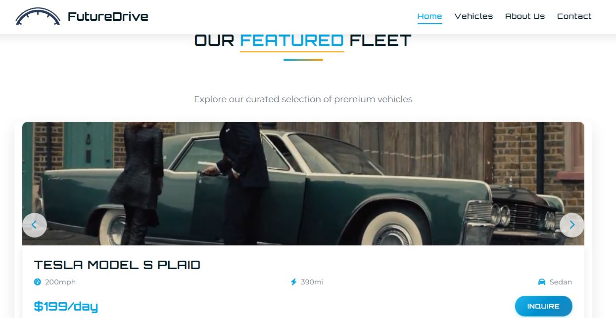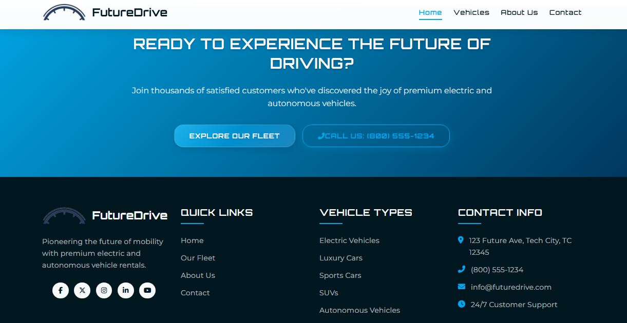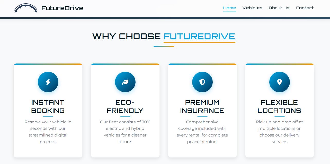 FutureDrive Rentals is an HTML template designed for modern vehicle rental businesses, specializing in electric, luxury, and autonomous cars. Built with pure HTML5, CSS3, and vanilla JavaScript, this template offers a fast, lightweight, and fully responsive solution without relying on bloated frameworks like Bootstrap. Its sleek, futuristic design features a dynamic hero section with side-by-side content and imagery, an interactive vehicle carousel, customer testimonials — all optimized for high conversion rates.