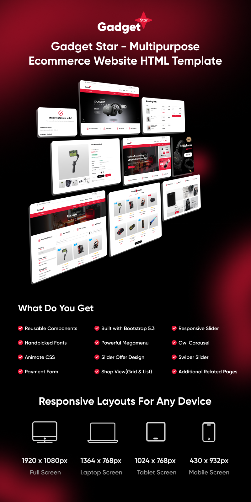 Responsive & Cross-Browser Compatible: Gadget Star is fully responsive, adapting perfectly to any device or screen size, from desktops to smartphones. Optimized for all major web browsers, it ensures a seamless and consistent user experience.