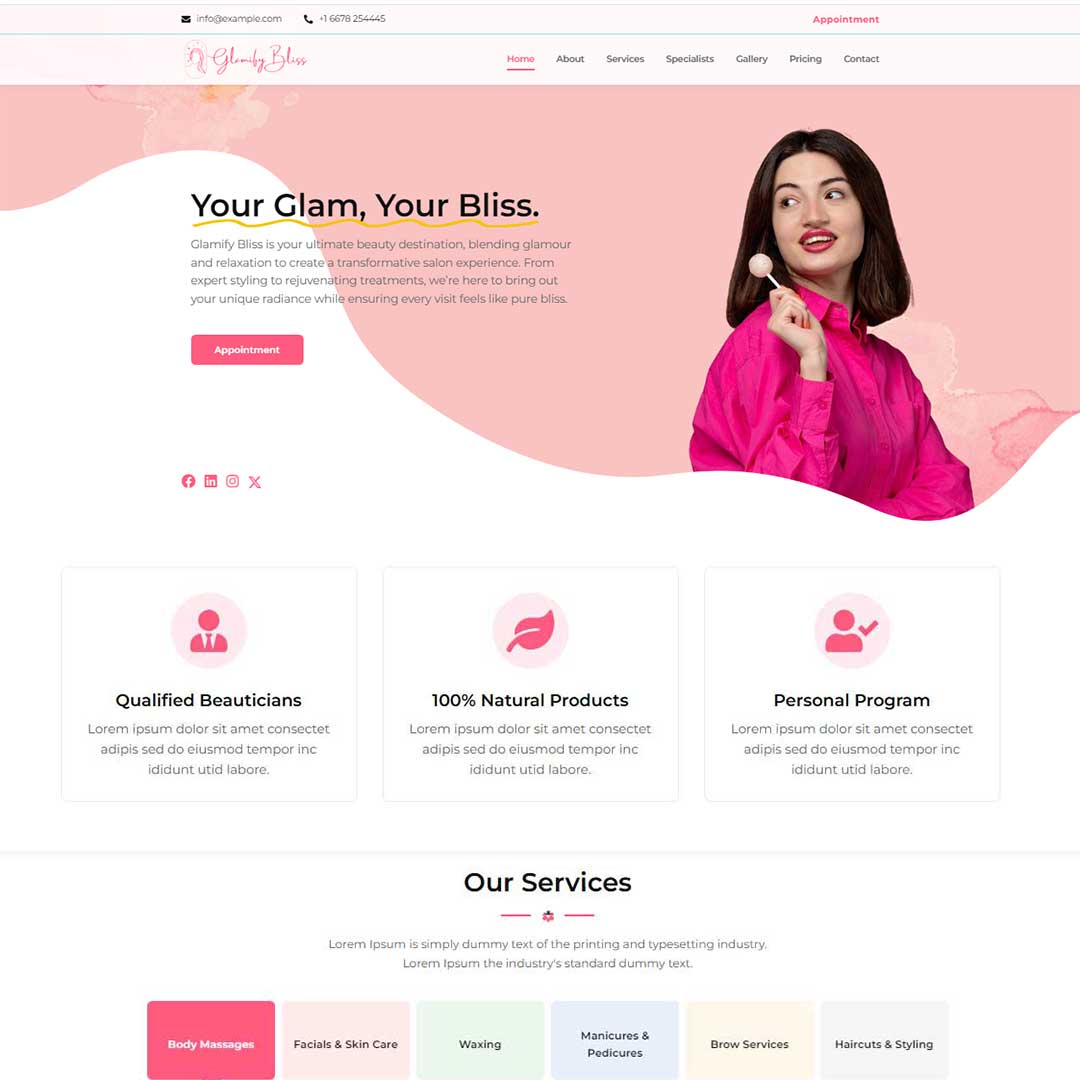 Launch your dream beauty salon website in no time with this all-in-one template. Whether you’re starting fresh or upgrading an existing site, the Glamify Bliss template ensures your business stands out.