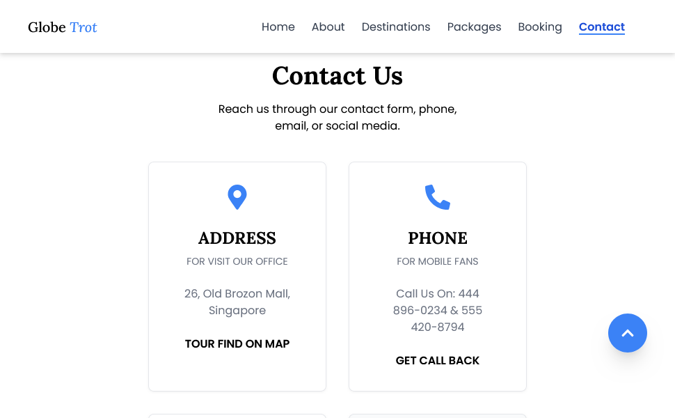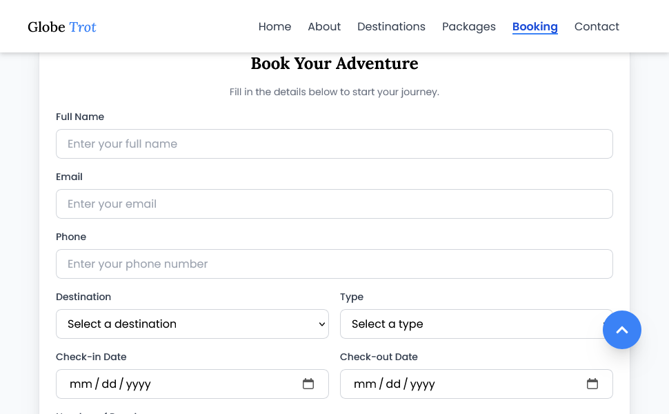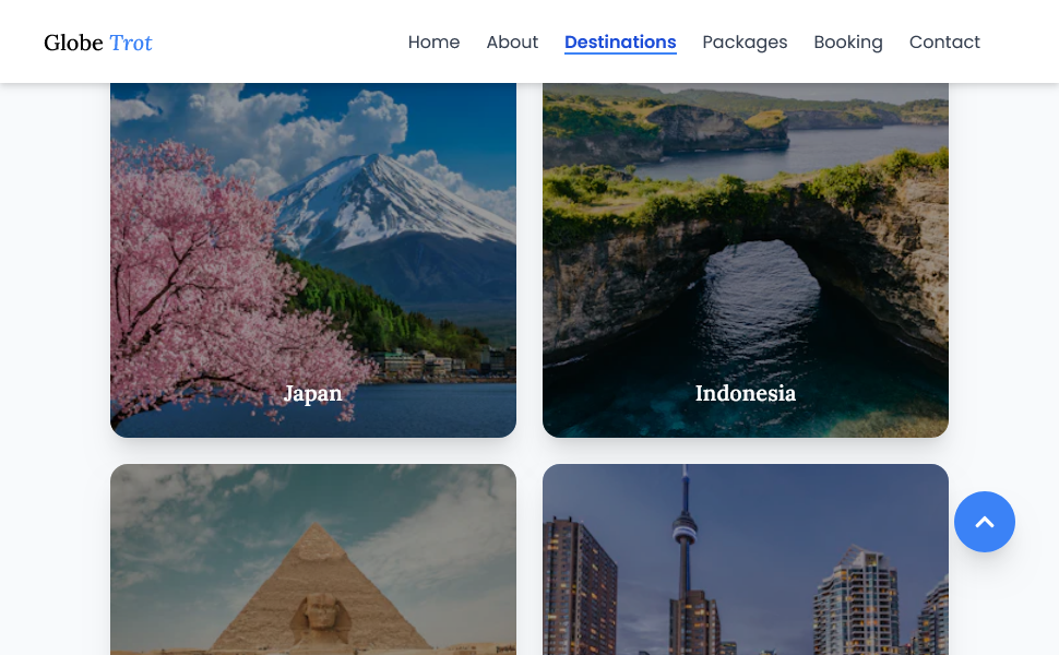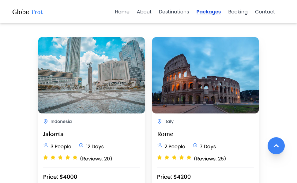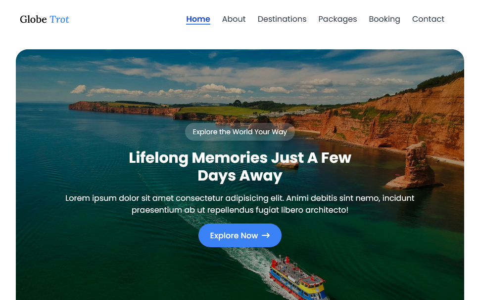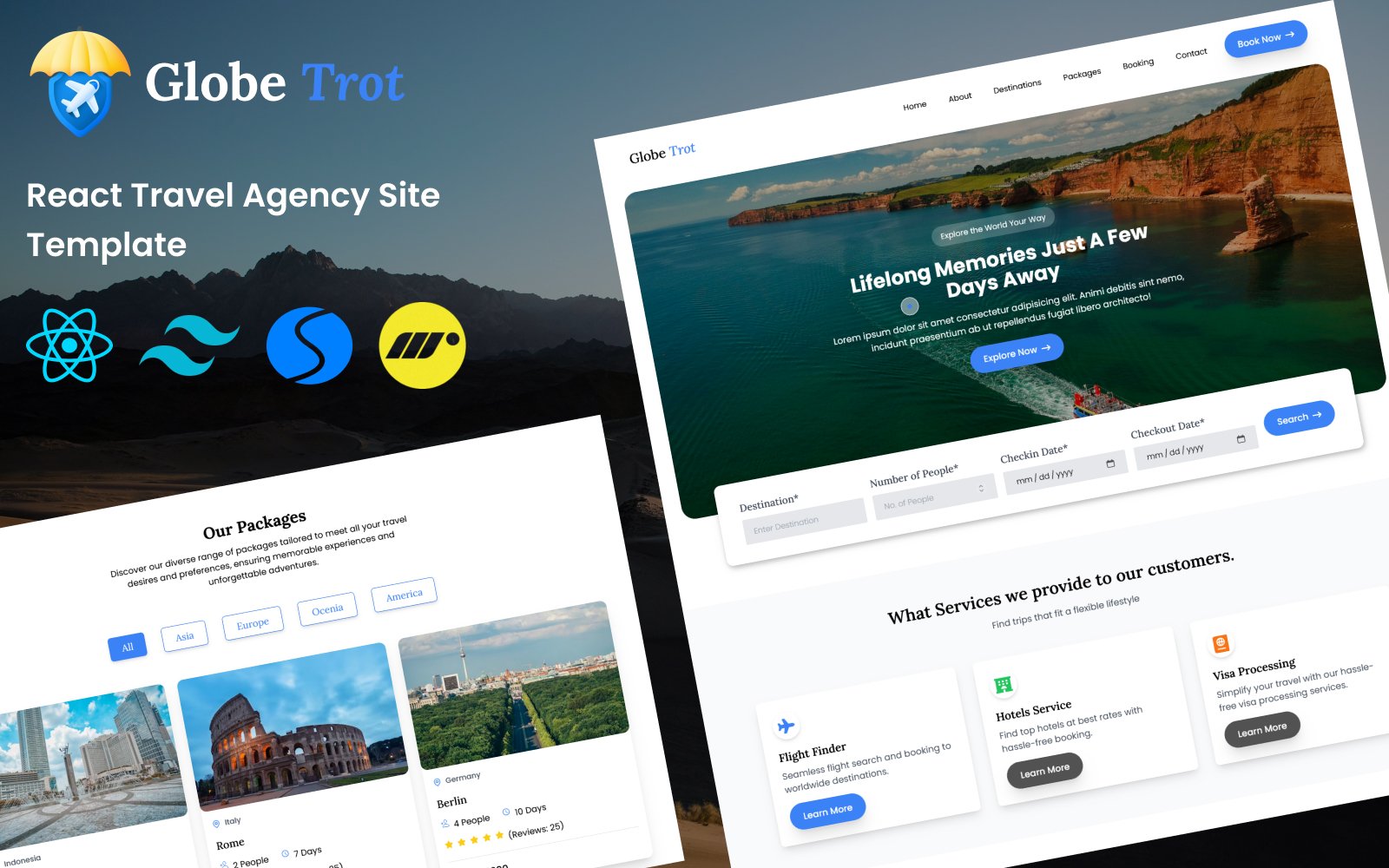 The "Globe Trot" modern and responsive React-based travel agency website template, built with React and styled with Tailwind CSS, offers a complete solution for showcasing travel packages and facilitating online bookings. Featuring dedicated pages for destinations, packages, about us, contact, and a fully functional booking form (using react-hook-form), it provides a seamless user experience enhanced by smooth animations (Framer Motion) and a custom loading screen. Built with a robust tech stack including React Router, react-icons, react-toastify, and potentially Swiper, this template saves time and resources while offering easy customization for branding and functionality. Ideal for travel agencies and businesses, it's a cost-effective alternative to custom development, ensuring a high-quality and professional online presence.