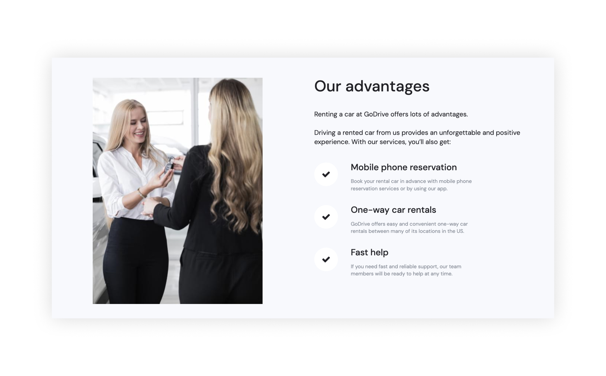 The GoDrive car rental Bootstrap 5 website template is a combination of modern design and detailed layouts. From texts to images and videos, this solution can handle anything you need. It is a suitable choice for not just car rental businesses. Repair workshops and car salesmen may also benefit from using it. In addition to that, a website owner gets a wide selection of features to supercharge their site. They can also make it more sustainable. This way it is possible to provide stable work for your site for many years to come. Here are some of the included features: