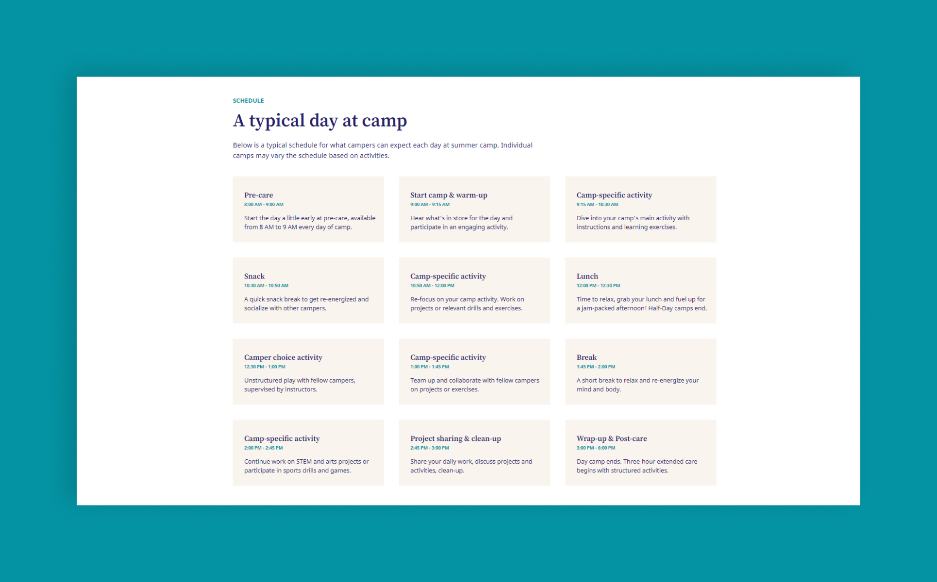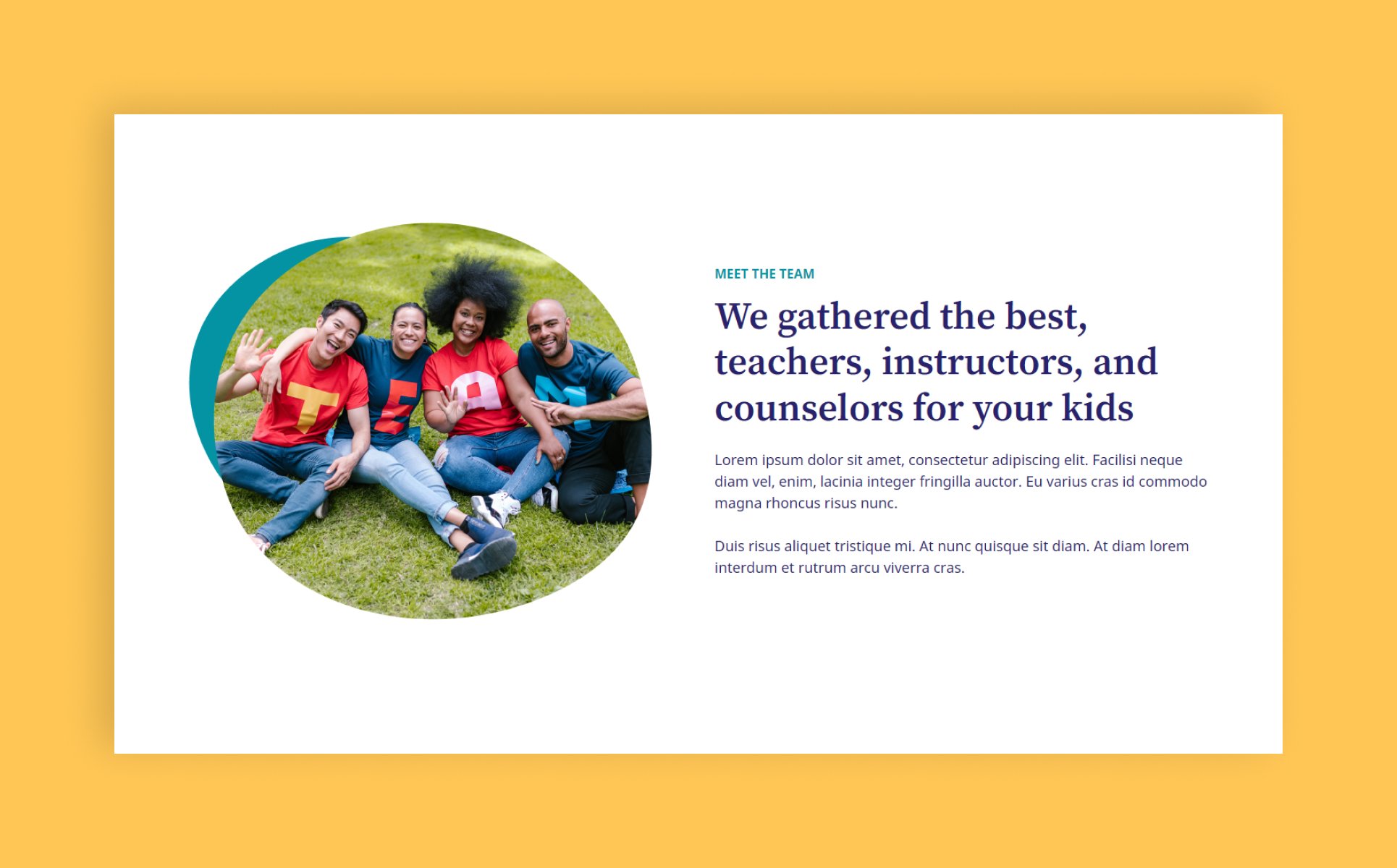 Talking about content, we should mention that our template is multipage. It contains a variety of pre-developed pages suitable for diverse purposes that any summer camp has. The Gold Arrow summer camp HTML5 website template has pages where you can tell more about your camp and its team. Also, you can post featured photos from the life of your camp via the Gallery page. Last but not least, our template has a separate Schedule page. It can be useful to parents who are looking for more information about your camp.