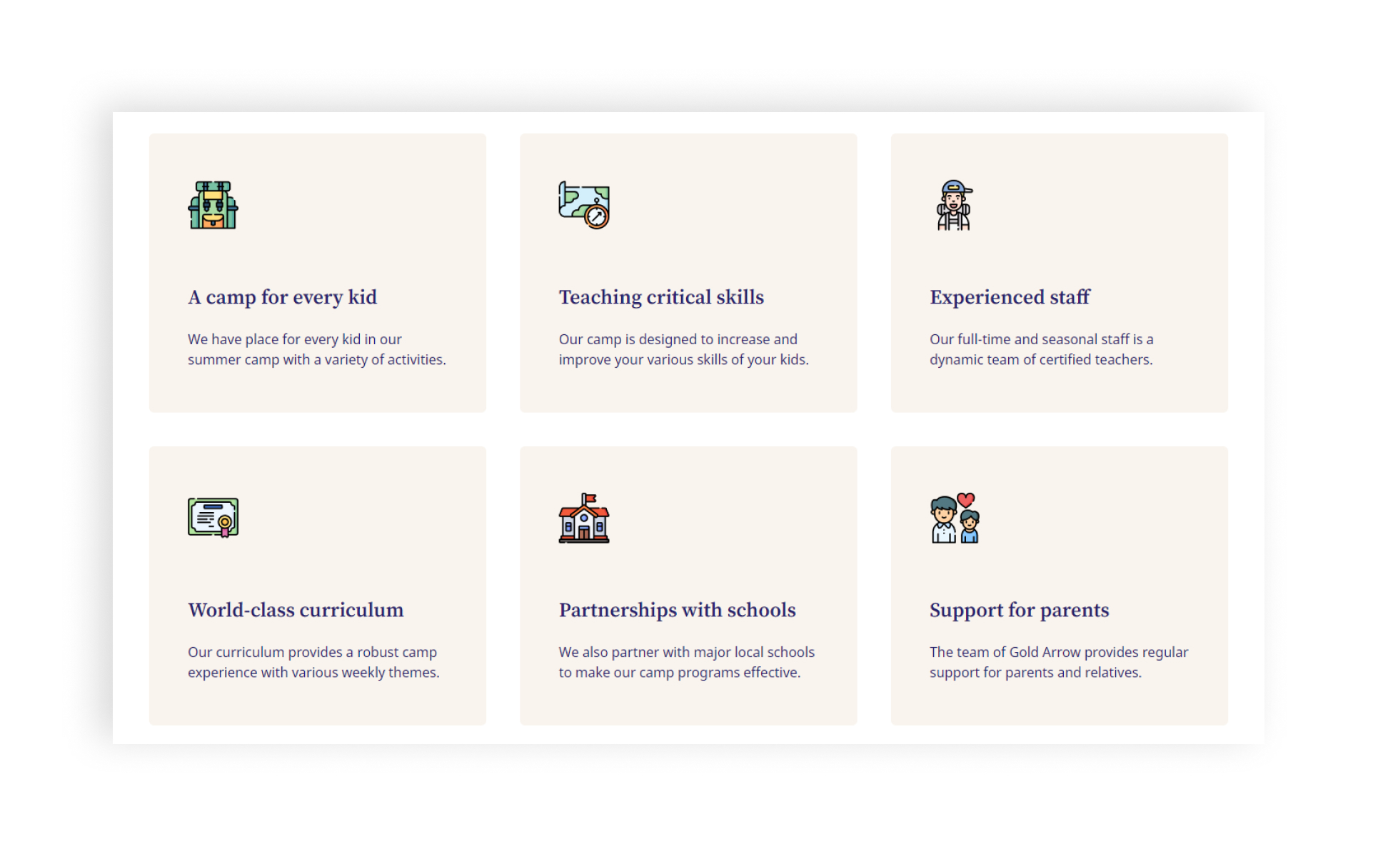 Aside from these advantages, there are other benefits that Gold Arrow offers. For example, you can use the built-in header & footer to improve website navigation. The colorful icons and impressive animations and transitions can make your website more visually appealing. With the dedicated content sections, this summer camp HTML5 website template can help you make an informative site.