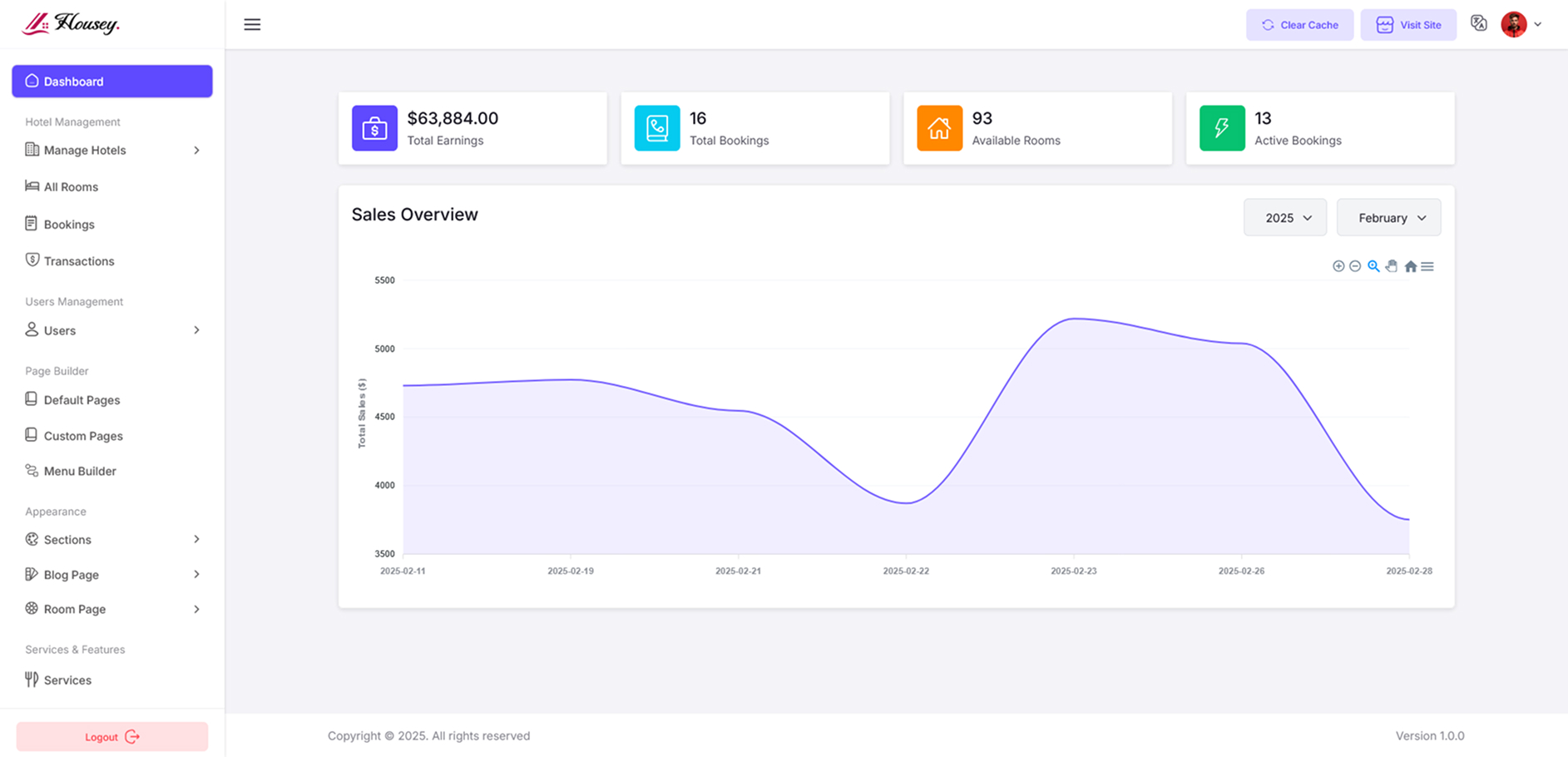 Housey Resort and Hotel Booking Laravel Script is the ultimate solution for managing and showcasing your hotel, resort, or vacation rental with modern functionality and stunning design. Built on the powerful Laravel framework, this script is tailored for hospitality businesses, offering clean, responsive interfaces and a robust backend for seamless management across all devices.