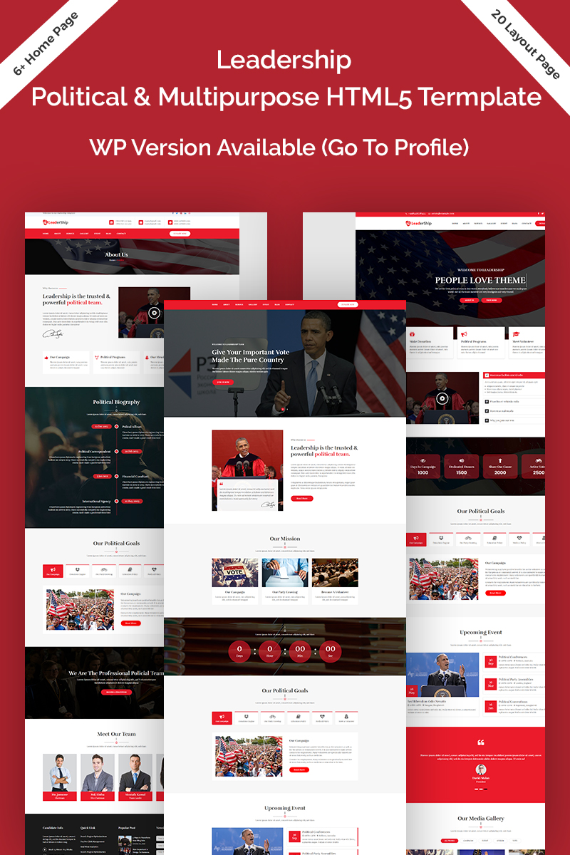 Leadership is a responsive political HTML5 Template. The template best for politician, legislator, democracy, political party, political campaign, political organization, event, lawyer, fundraising, government, super PAC politics, political, candidate, campaign, democracy, government, political party, political leader, election, politician, public and motivational speaker, republican, donation, lawyer, charity, activist, Democrat , fundraising. The template is a modern design and clean code. This is a 100% responsive template for any browser.