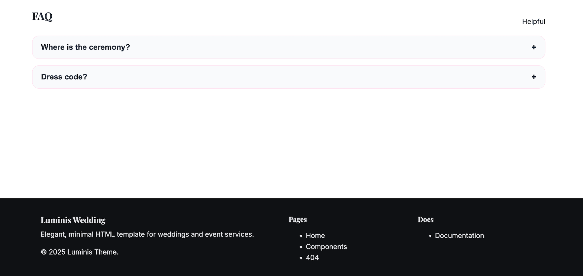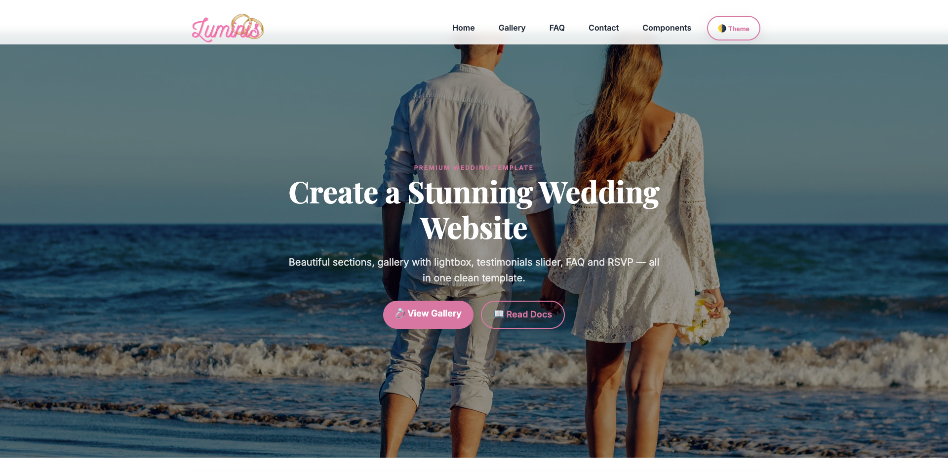 Luminis Wedding is a refined and modern HTML template designed for weddings, engagements, and romantic events. With a clean pastel design, elegant typography, and smooth animations, it allows couples and event planners to create a professional website in minutes.