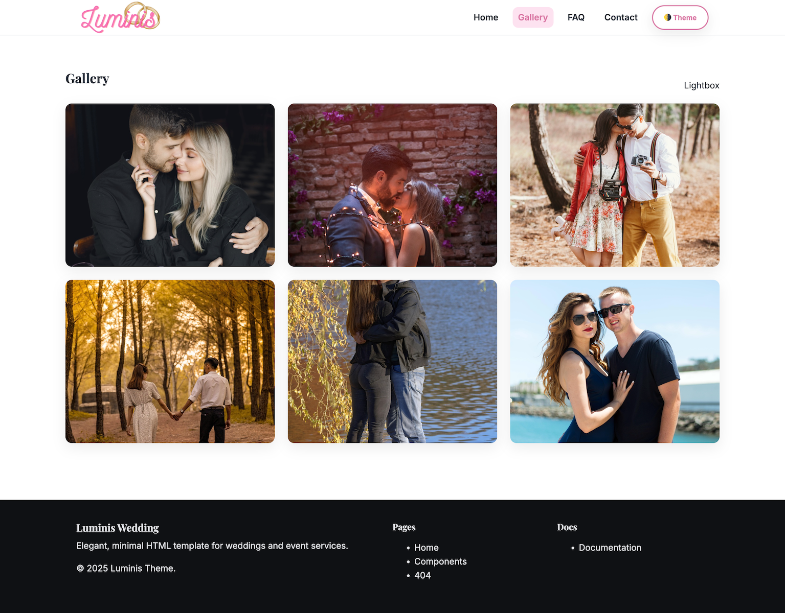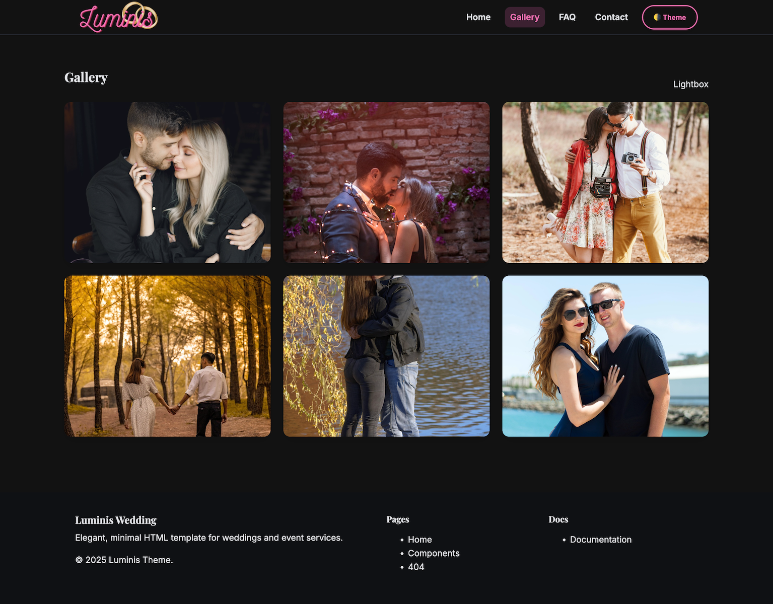 Built with semantic HTML5, CSS Grid/Flexbox, and vanilla JavaScript, Luminis Wedding is lightweight, SEO-friendly, and easy to customize.