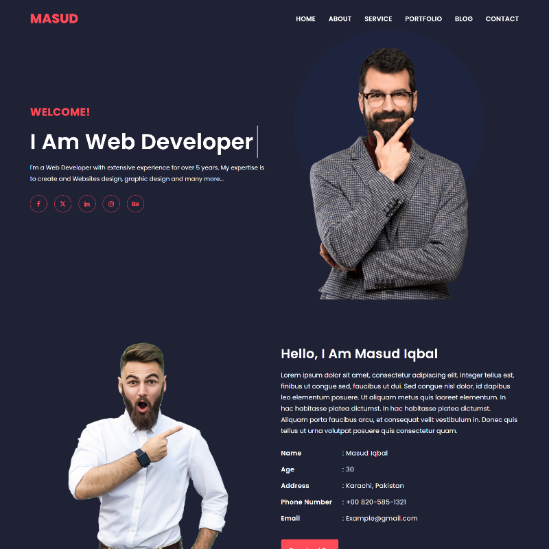 Masud is an HTML5 Multipurpose Website Template. Masud is Professional CV Template. Masud is a Portfolio Themes page made with html5 and css3. It is fit for any web agency, IT Expert, resume developer & Marketer. Masud website theme will support you to show your work and service. This Website Template is created for web experts, Photographers and freelancers. Masud is a show of your project and creativity. Masud is made for web developers, UI/UX developers, businessmen and job holders.