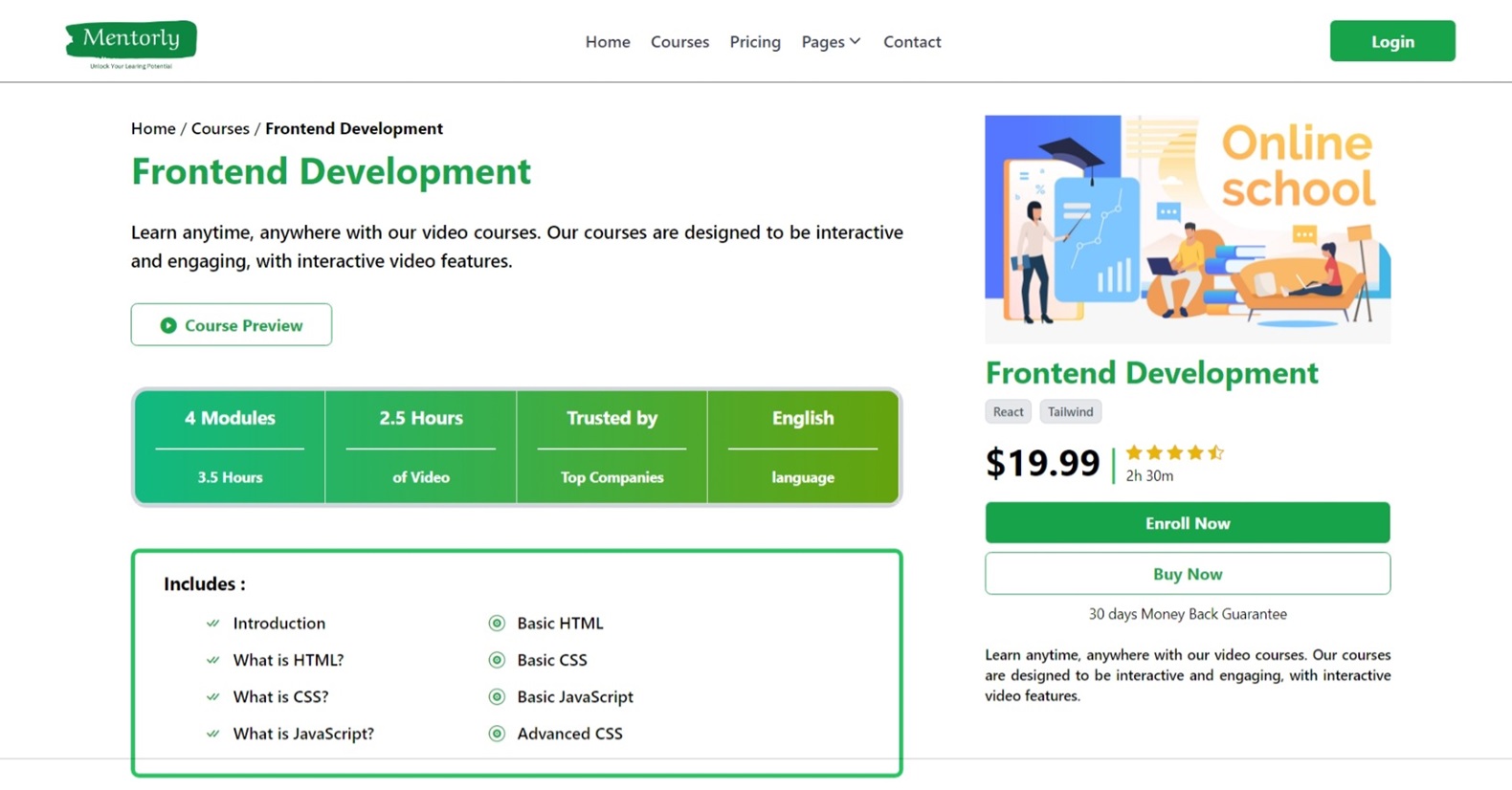 - Modern Design: Mentorly boasts a sleek and modern design that captivates users from the moment they land on your platform. With clean layouts and visually appealing elements, your content takes center stage.