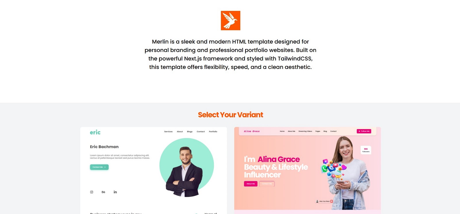 Merlin is a sleek and modern HTML template for personal branding and professional portfolio websites. Built on the powerful Next.js framework and styled with TailwindCSS, this template offers flexibility, speed, and a clean aesthetic. It includes variations suitable for professionals such as freelancers, consultants, artists, photographers, and others. Merlin offers the ideal platform for establishing a captivating online presence, thanks to its modular structure, customizable features, and responsive layout.