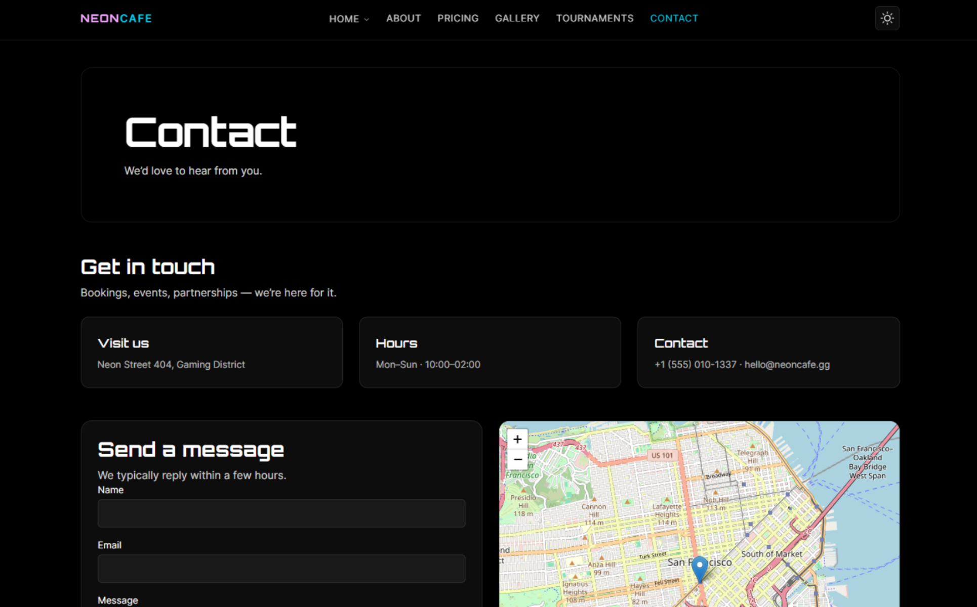 Built on a cutting-edge tech stack, Neon Gaming Café delivers the performance your brand deserves. Leveraging the power of React 18 and Vite, the theme offers blazing-fast load times and a silky-smooth user experience. Customization is effortless thanks to Tailwind CSS, giving you granular control to perfectly align the design with your brand's specific vision. With Framer Motion, subtle, fluid animations bring your site to life, creating a dynamic feel without compromising on speed.