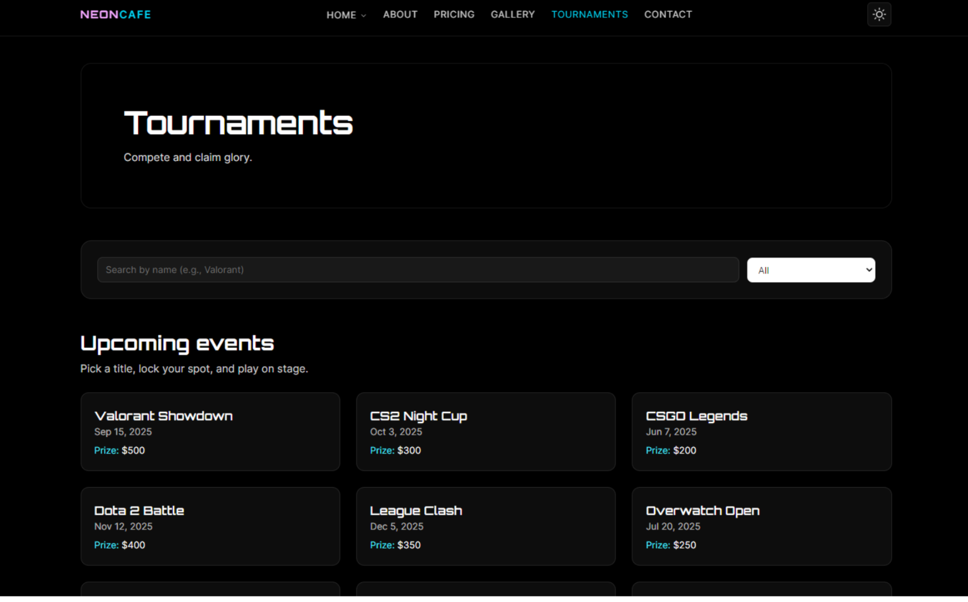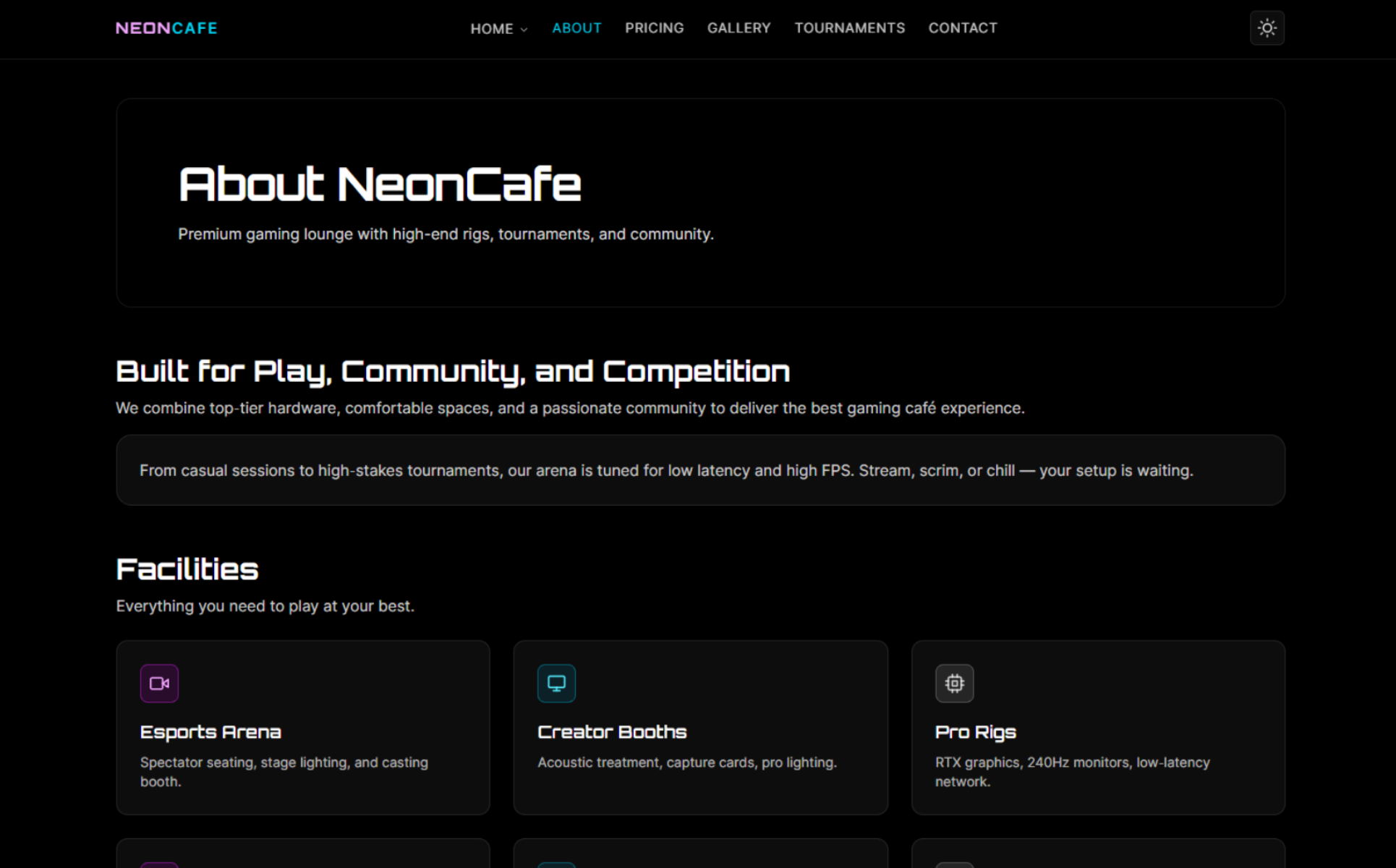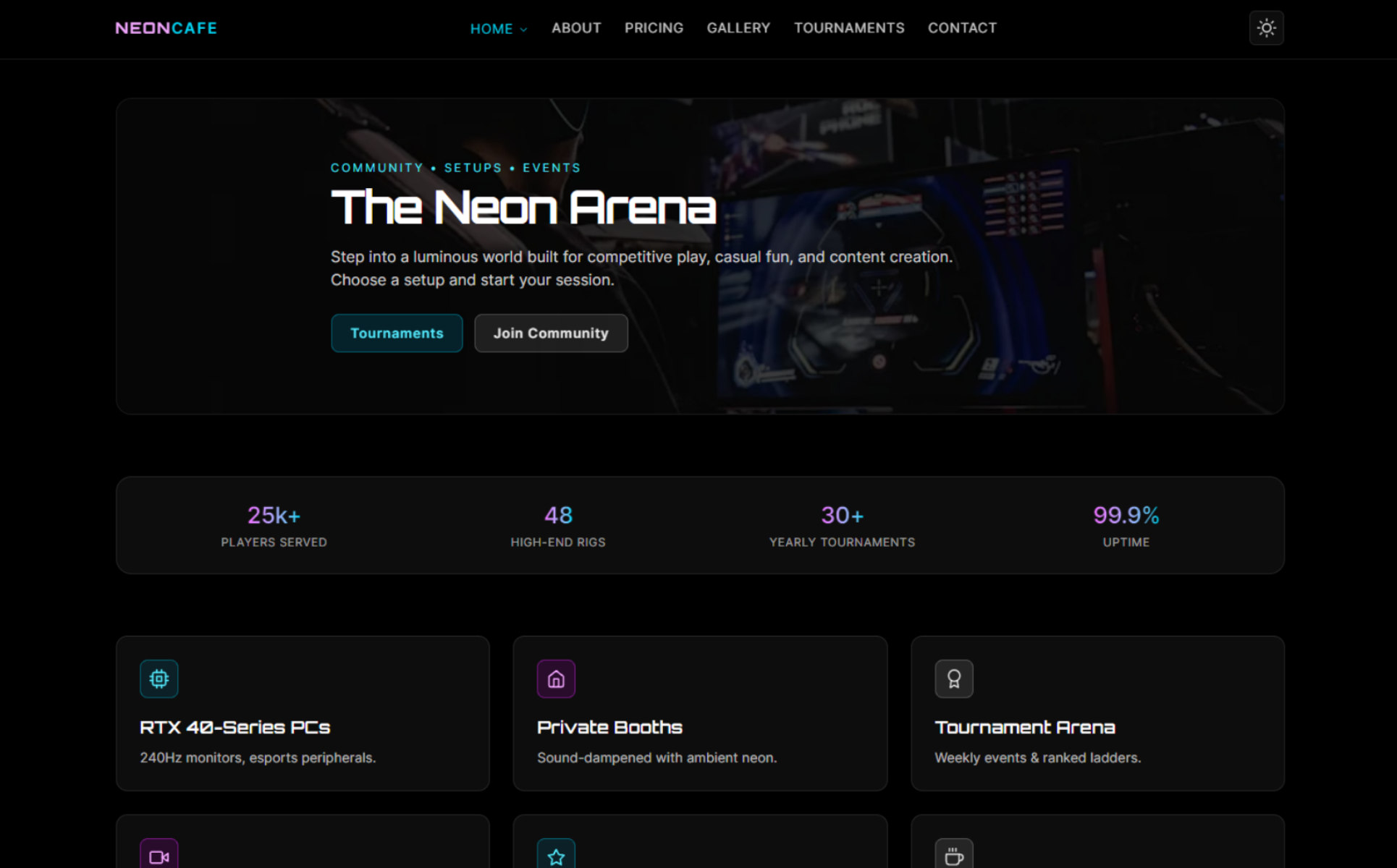 Dominate the digital arena with Neon Gaming Café, the ultimate React theme designed for the high-octane world of esports, LAN centers, and modern gaming lounges. This is not just a template; it is a complete toolkit for building a powerful, immersive online presence that captivates your audience and keeps them coming back. We crafted its vibrant, cyberpunk-inspired aesthetic to perfectly reflect the energy and passion of the gaming community.