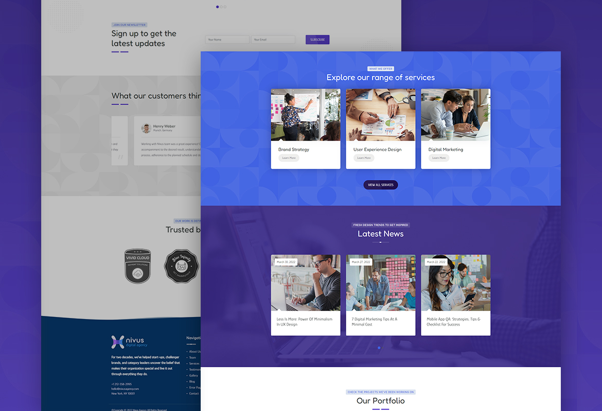 Nivus is a sleek and modern web template that can elevate your online presence and make you stand out from your competitors. Whether you are a marketing agency, a startup, an IT business, a web designer, a web developer, a marketer or any other type of technology related business, Nivus is the perfect choice for you.