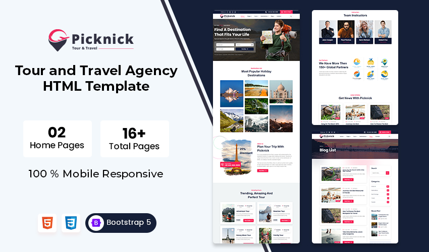 The Picknick Tour and Travel Agency HTML Template offer a sleek, modern, and clean aesthetic, paired with a well-balanced color palette that enhances the user experience. Perfectly designed for tour operators, travel agencies, and businesses in the travel and tourism industry, this template is an ideal choice for promoting tourism, trips, destinations, and booking services.