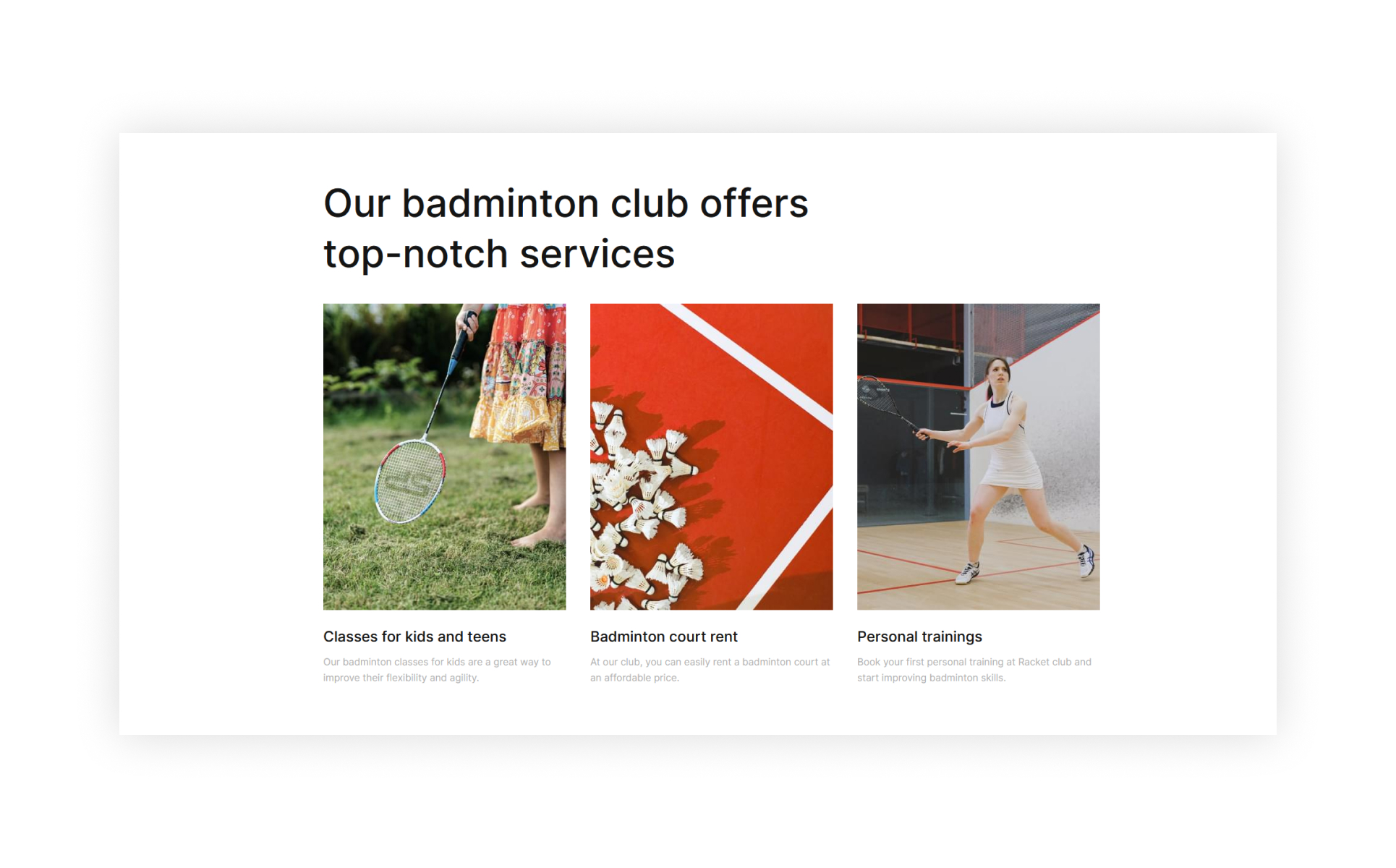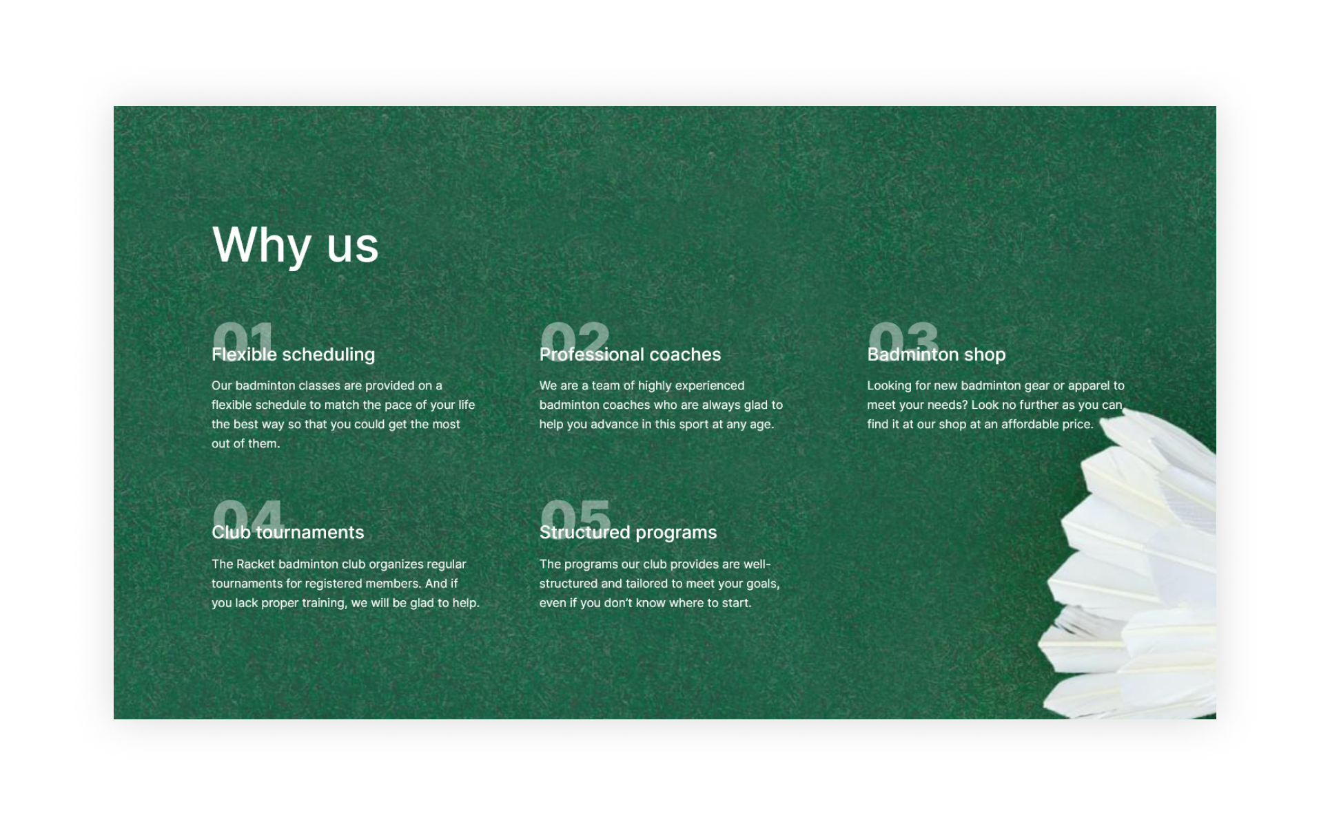 However, if you want to save time and money on web development, we recommend using HTML5 website templates. They are affordable and easy to use. Due to the Bootstrap 5 framework, such solutions are also responsive. Any website built with such templates will run smoothly on any device, from PCs to smartphones. Besides, such solutions are also customizable. If you are looking for such a template to build a badminton club website, we have a solution that may meet your needs perfectly.