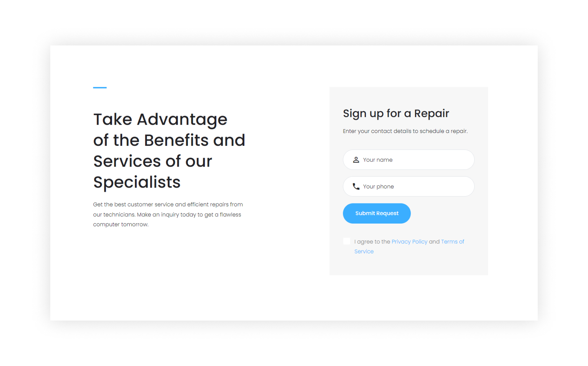 Besides the abovementioned advantages, there are other reasons to choose Recone. This mobile repair services HTML5 template also offers a full-width section with a background video. It can help you attract your customers' attention. Besides, you can showcase your achievements with the help of counters. Moreover, our template offers a well-designed slider section for services and testimonials. The integrated working forms are an awesome choice for making your site more interactive.