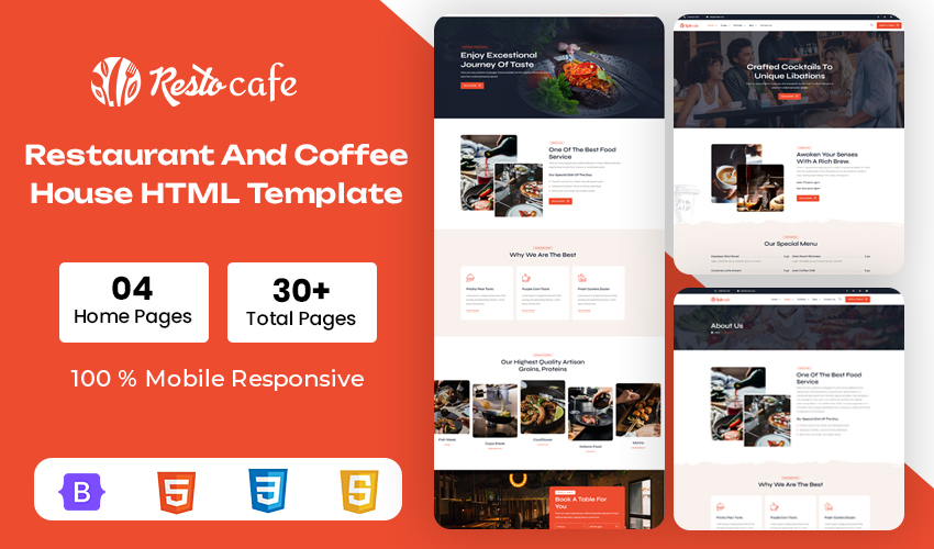 Restocafe is a clean and professional site template, ideal for restaurants, bakeries, cafes, and any food-related business. Built on the powerful Bootstrap 5 framework using HTML5 and CSS3, it offers a fully responsive design that looks great on all devices. Key features include 4 unique homepage layouts, dedicated pages for Menu, Blog, and Gallery, as well as an Ajax working contact form. Designed with a modern and clean design, Restocafe follows the Bootstrap grid system, making customization simple and flexible to suit your needs.