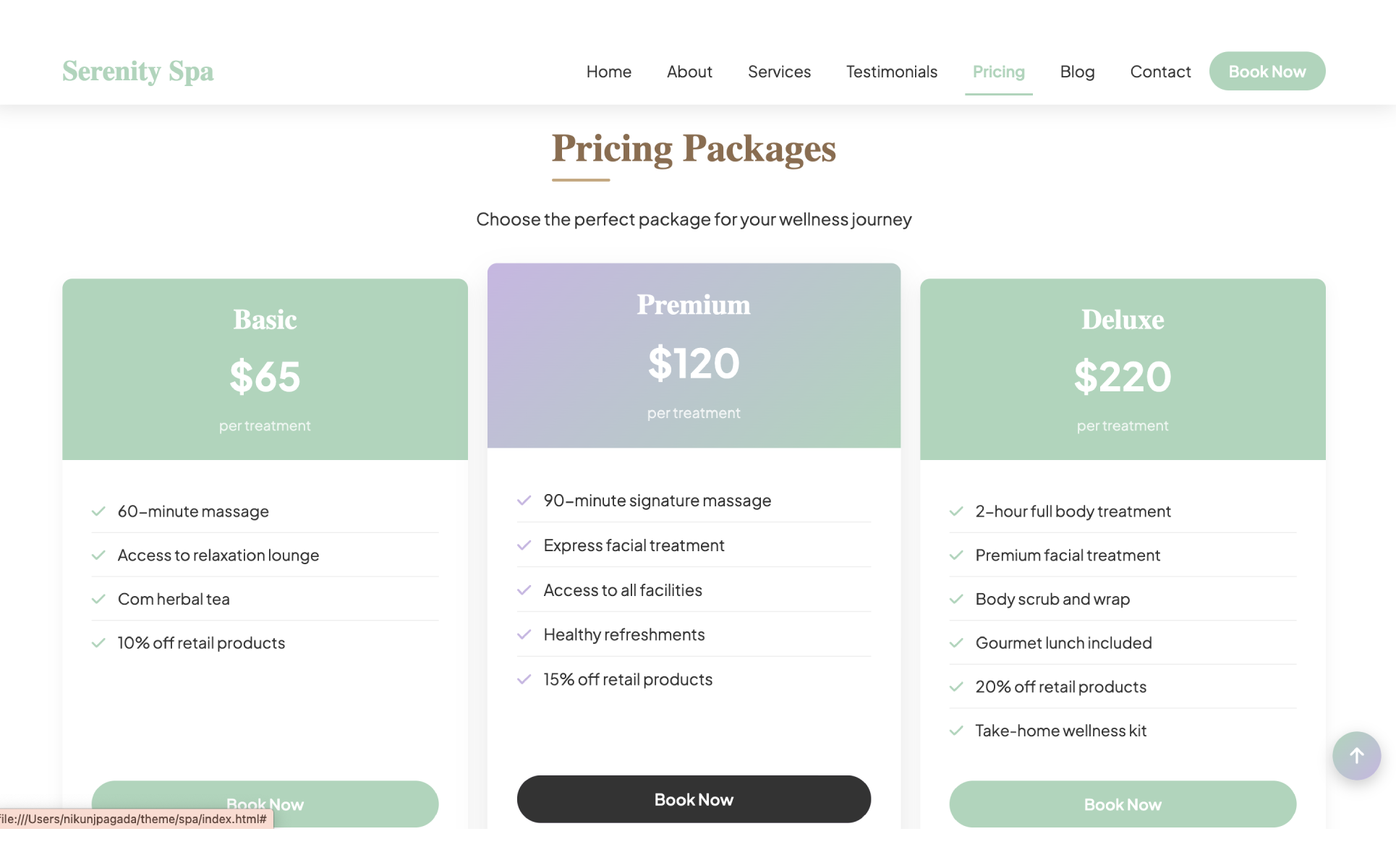 Serenity is a beautifully crafted Spa & Wellness Bootstrap template created to help beauty salons, yoga studios, massage therapists, health centers, and wellness businesses build a professional online presence with ease. Designed with a calming aesthetic and modern layout, Serenity combines elegance with functionality to reflect the soothing nature of wellness services. Its clean structure and thoughtfully arranged sections allow you to showcase your services, introduce your team, display pricing, and even manage bookings effortlessly. Fully responsive and optimized for performance, the template ensures that your visitors enjoy a seamless browsing experience on any device, from desktops to smartphones. Whether you’re launching a new spa website or refreshing an existing one, Serenity gives you the perfect foundation to create a site that feels inviting, trustworthy, and aligned with the peaceful atmosphere of your brand.