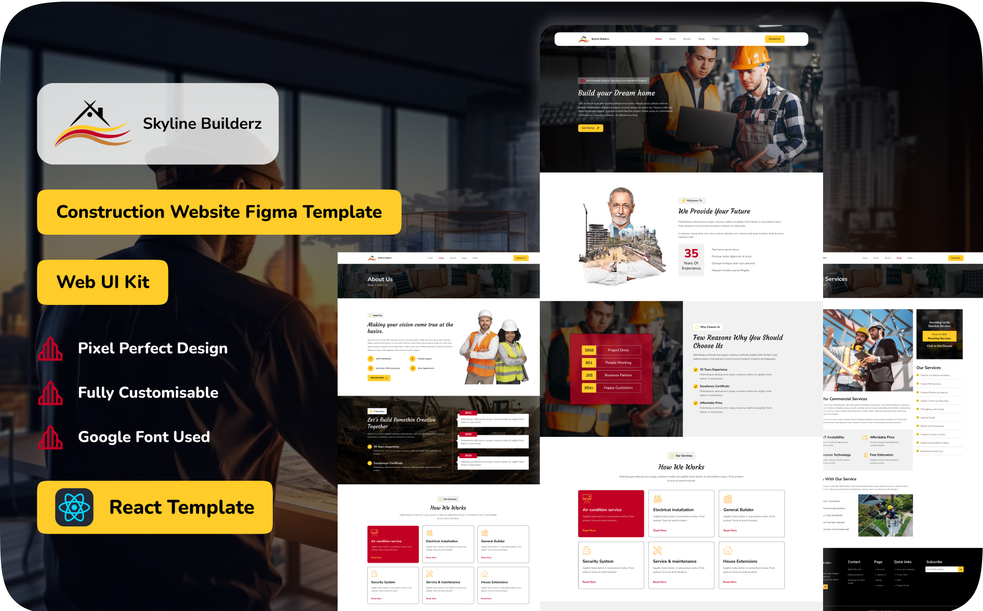 The Skyline Builderz Construction Website React Template is a modern and fully customizable design solution tailored for construction companies, architects, and real estate developers. Built with React, it features a clean and professional interface with sections for showcasing projects, services, team members, client testimonials, and contact information. The template is fully responsive, ensuring optimal performance across all devices. Ideal for developers looking to create a high-quality website, Skyline Builderz provides all the essential components to establish a strong online presence and effectively promote construction and architectural services.