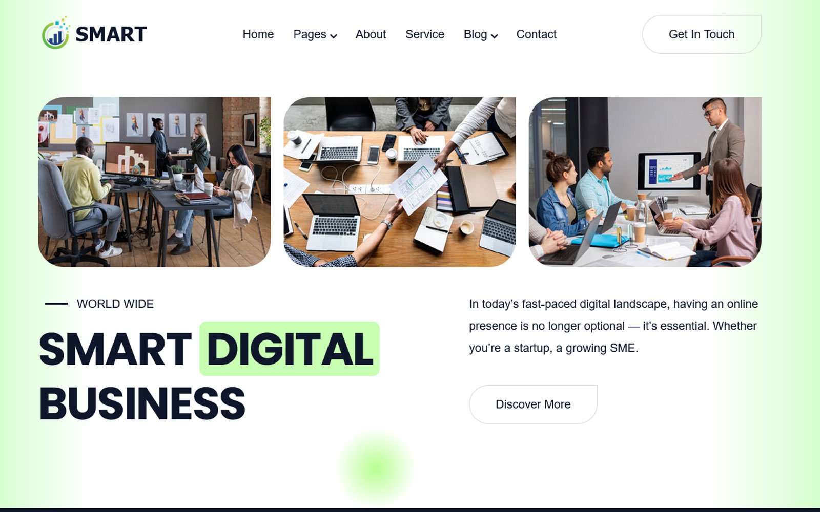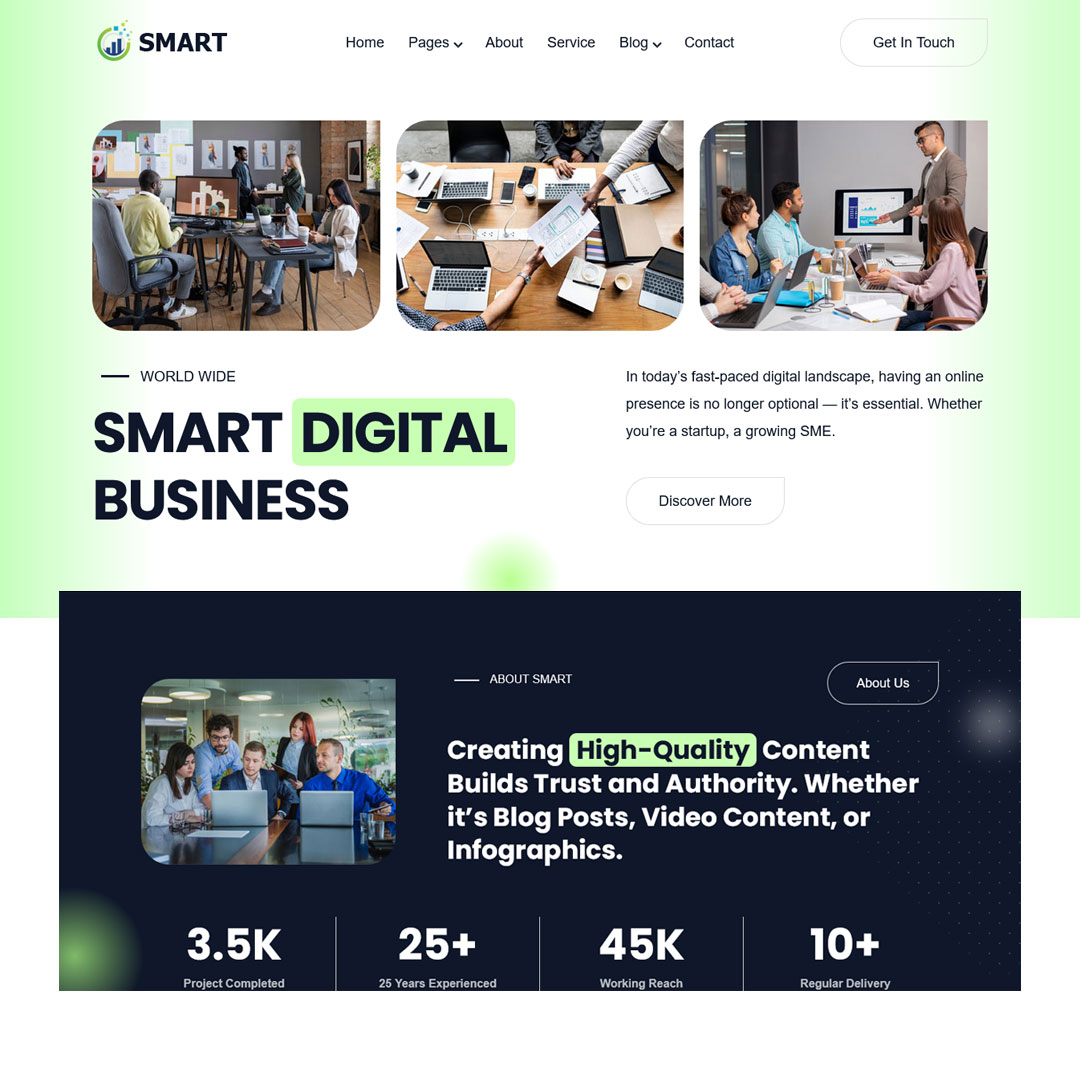 With essential sections like Services, Portfolio, About, Team, Blog, and Contact, Smart helps you showcase your brand and build a strong online presence effortlessly.