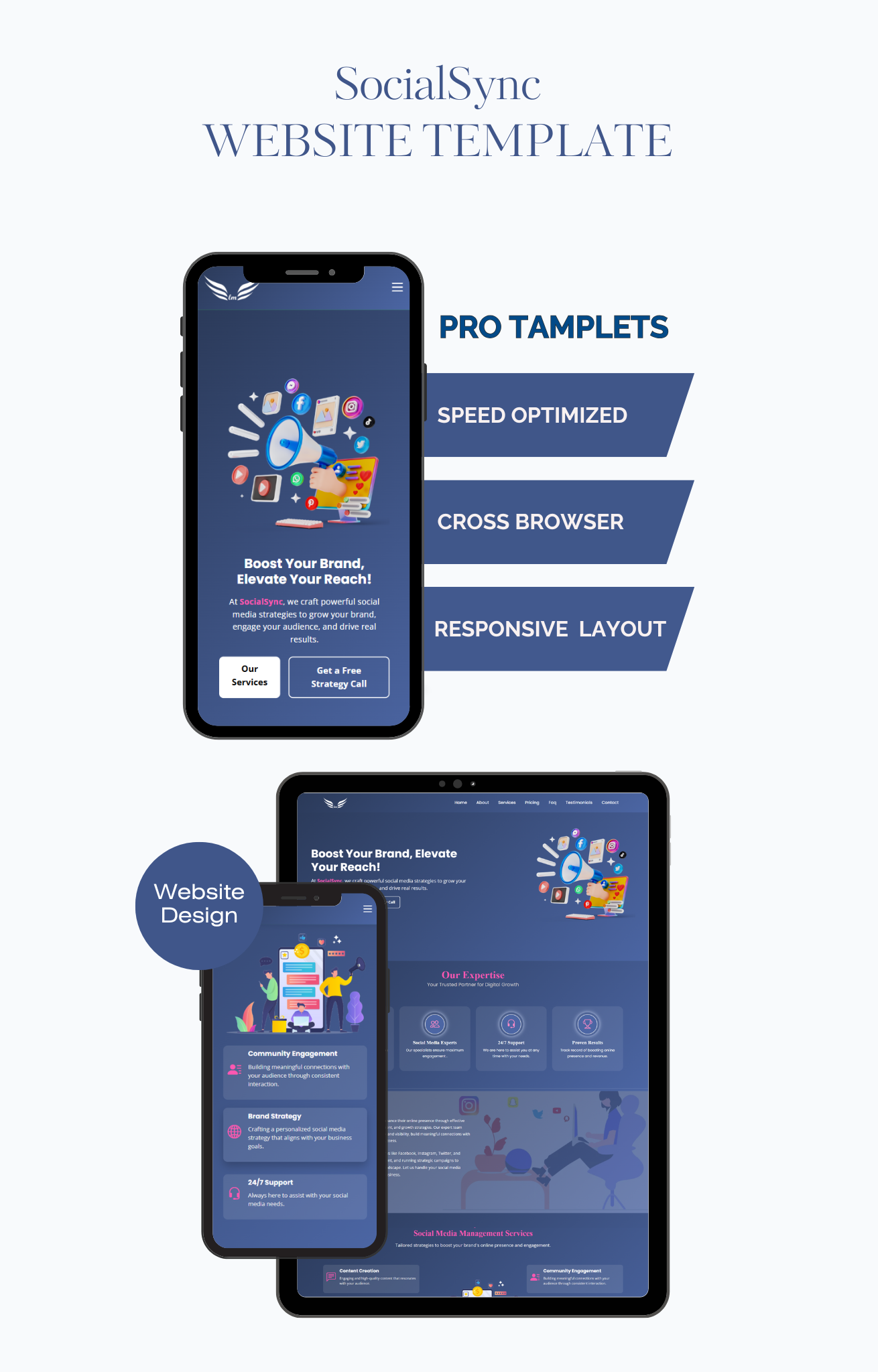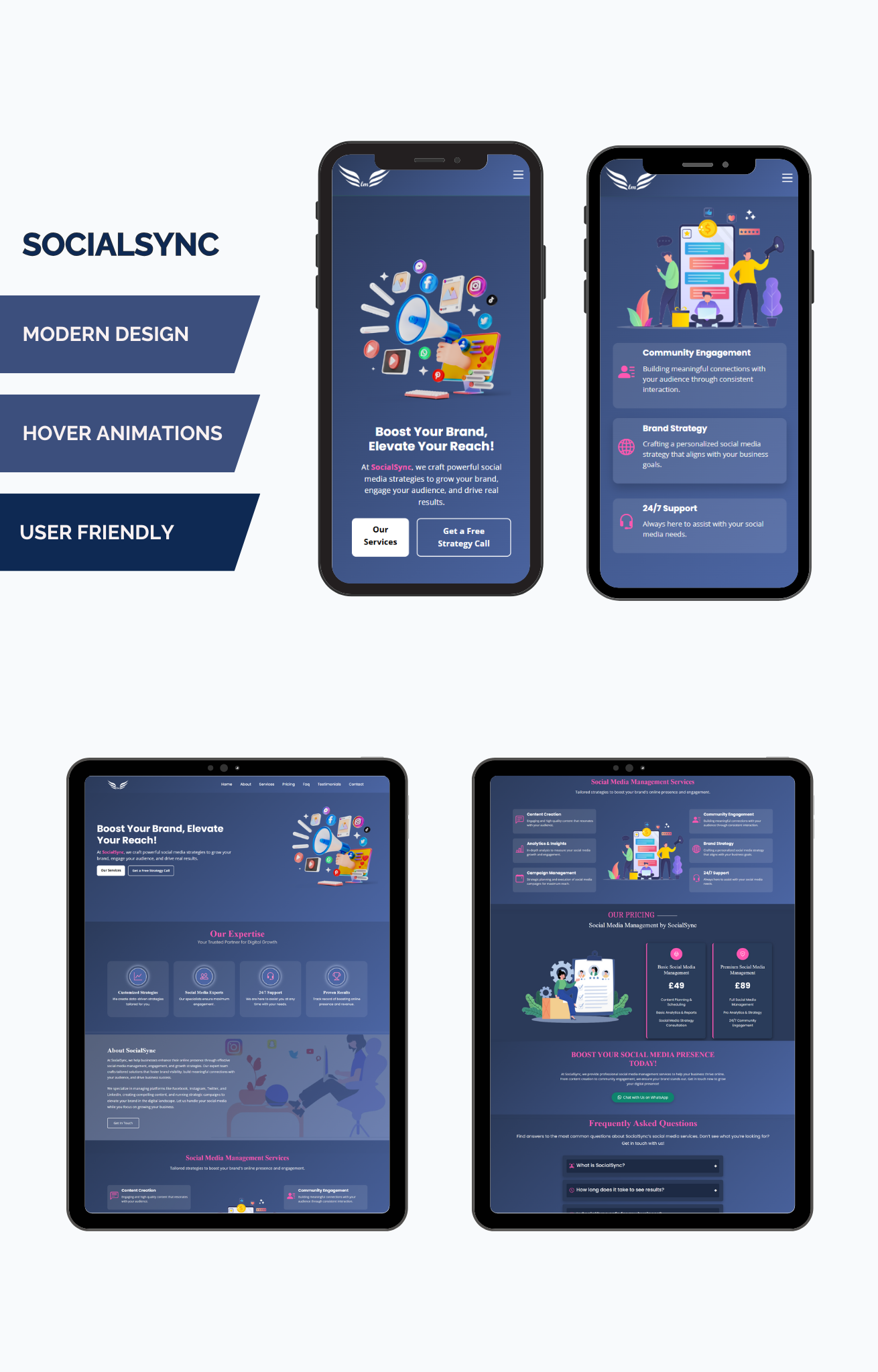 - Responsive and Adaptive Design: SOCIALSYNC automatically adjusts to fit all screen sizes, ensuring your site looks great on desktops, tablets, and smartphones, no matter the device your clients are using.