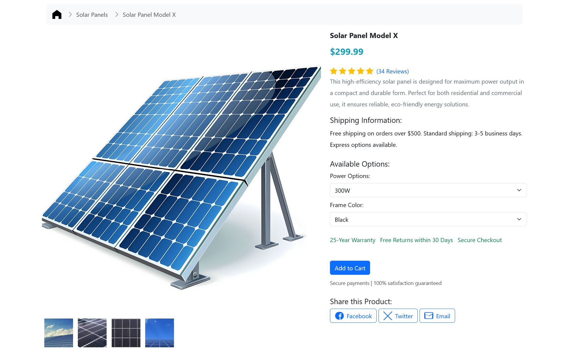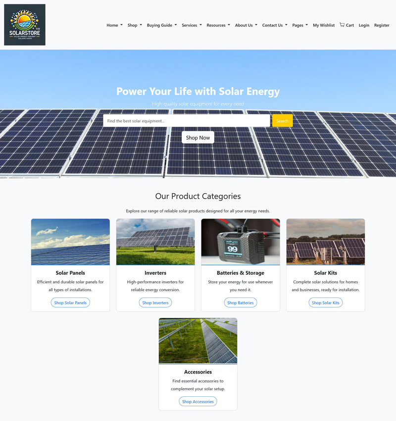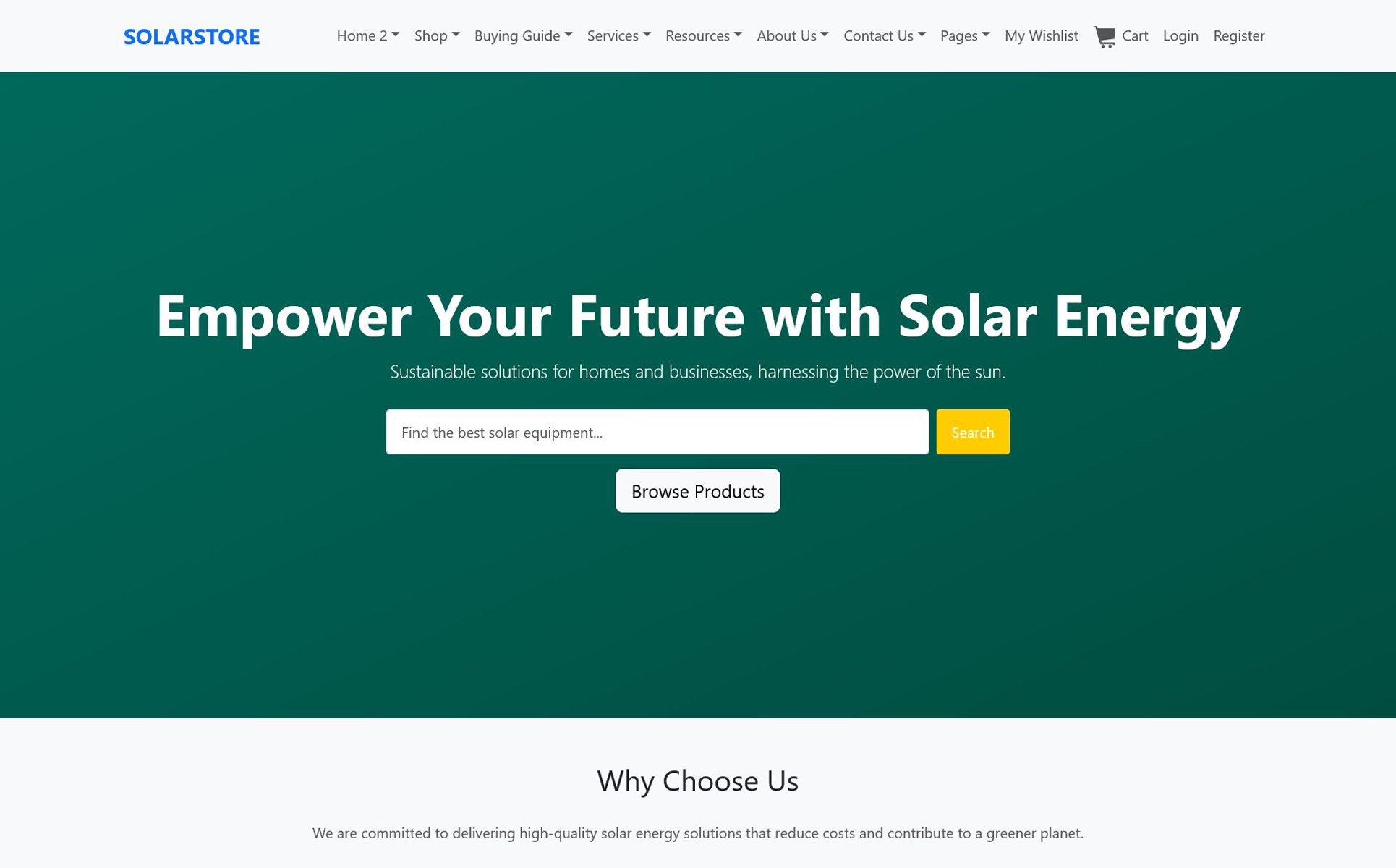 SolarStore is a modern and fully responsive website template designed for businesses specializing in solar energy equipment and renewable energy solutions. Perfect for solar panel distributors, installers, and green energy companies, this template features user-friendly navigation, detailed product pages, and sections for customer support and resources. It includes tools for showcasing solar panels, inverters, batteries, and other equipment, along with calculators and guides to help customers make informed decisions. Tailored for the clean energy niche, SolarStore is ideal for promoting sustainability and eco-friendly products online.
