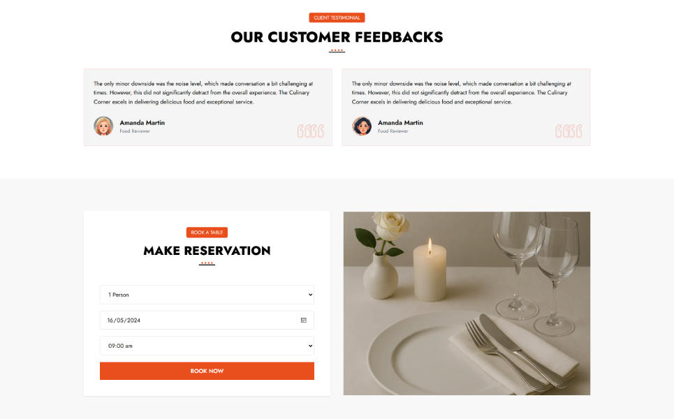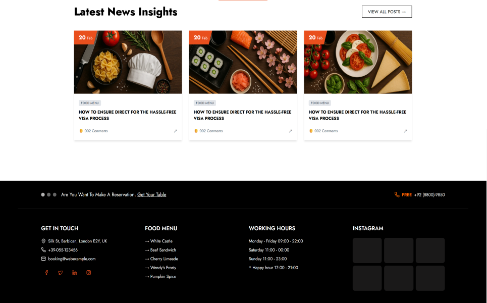 - Photo Galleries: Display your best dishes and ambience in elegant, full-width sliders.