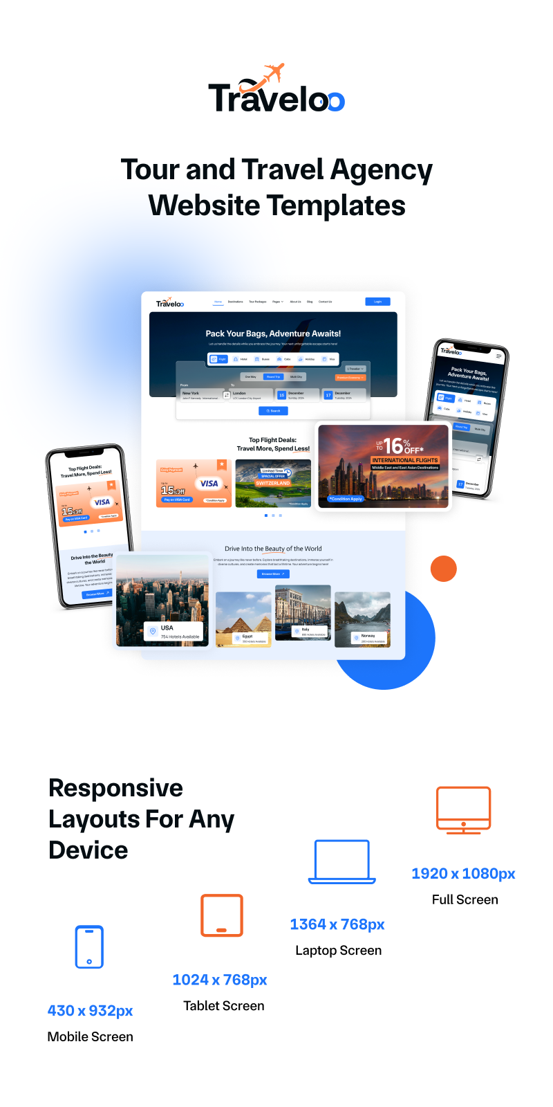 - Fully Responsive & Mobile-Optimized - Traveloo adapts perfectly to all screen sizes and devices, ensuring travelers can plan on the go—from mobile to desktop.