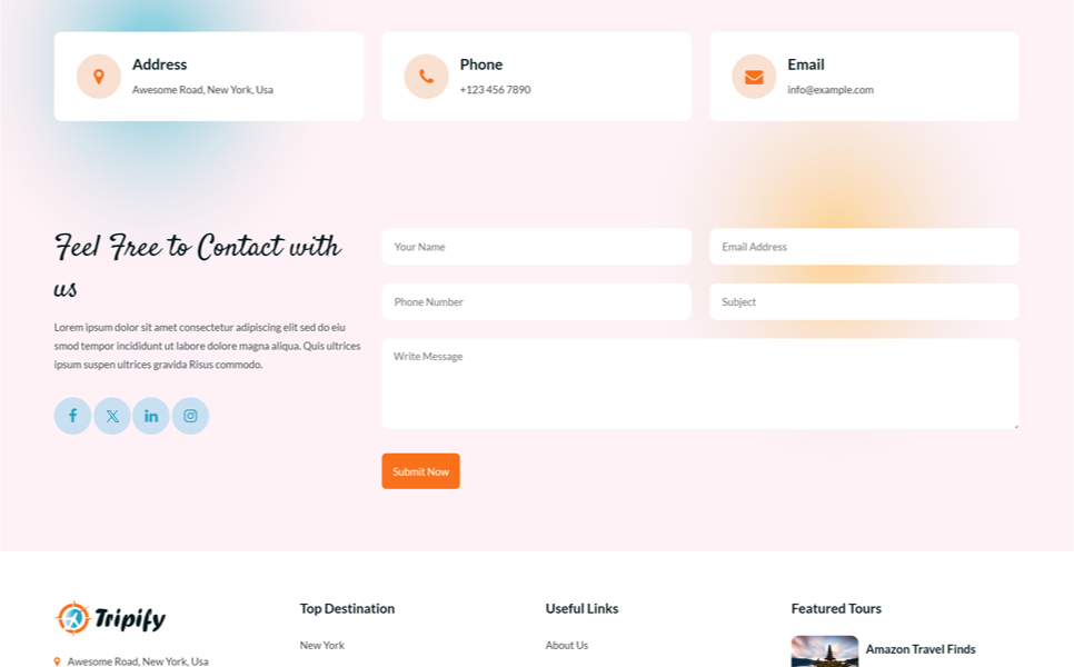 The Tripify HTML Website Template is a stylish and fully responsive solution designed for travel agencies, tour operators, and adventure companies. With its modern design and intuitive layout, Tripify is perfect for showcasing travel packages, tours, destinations, and services.