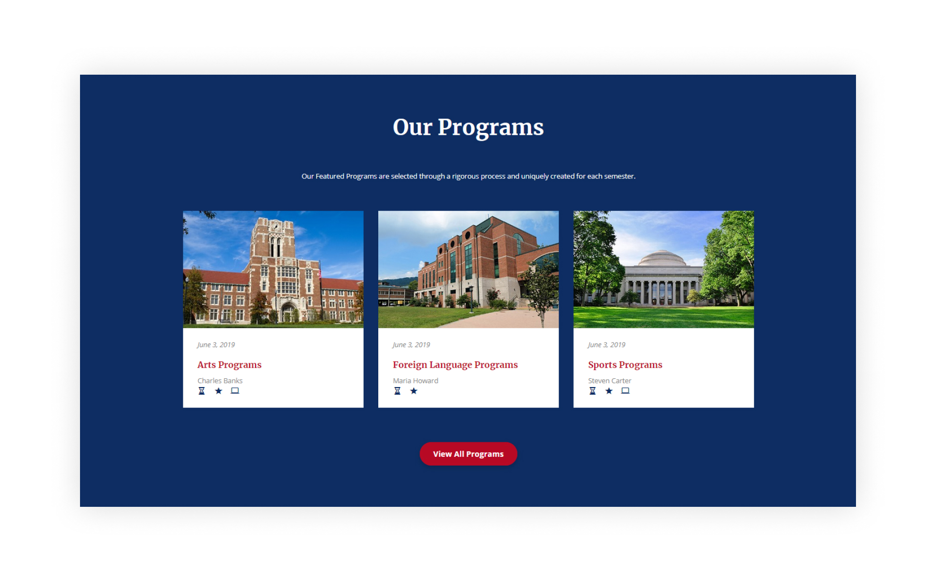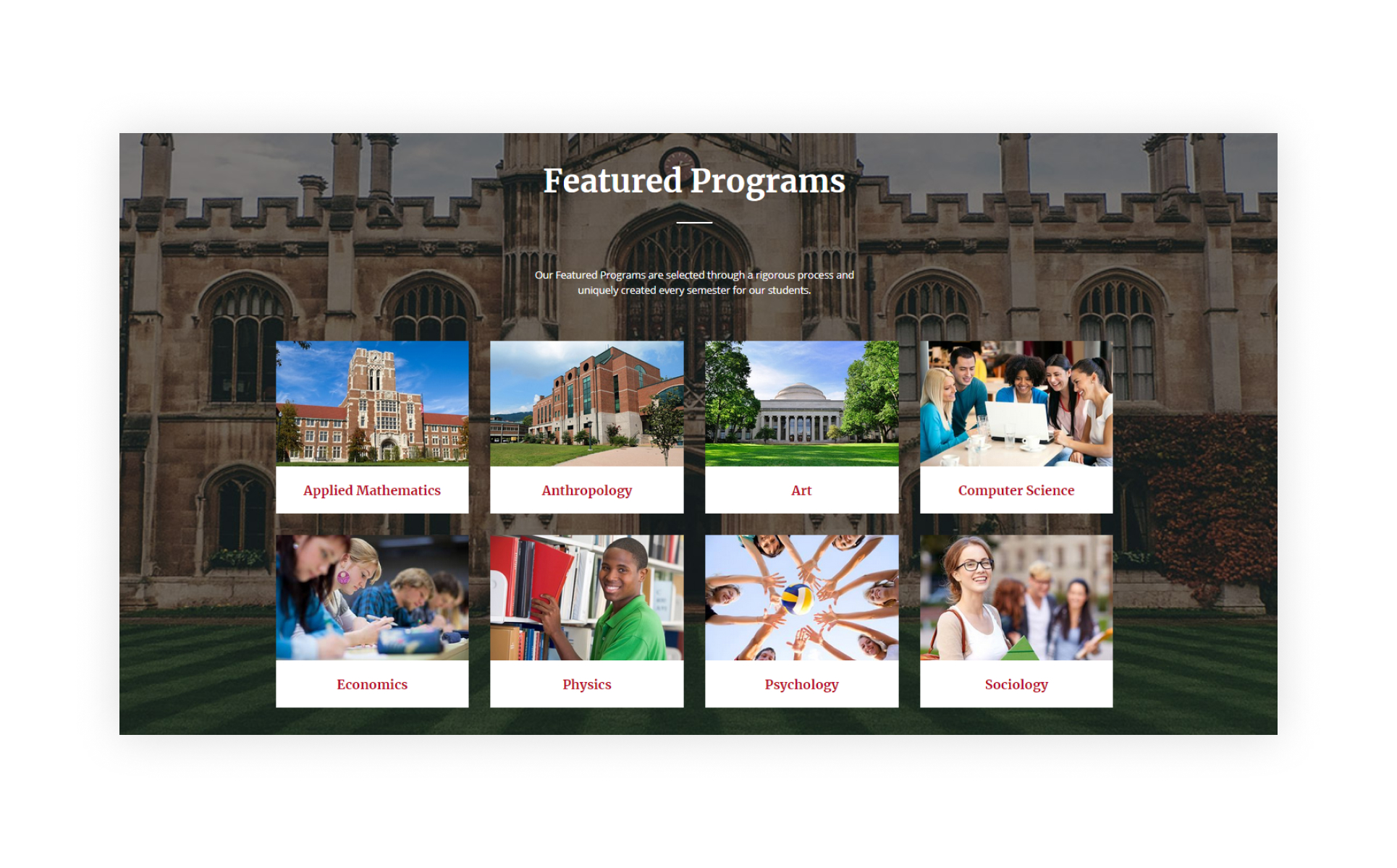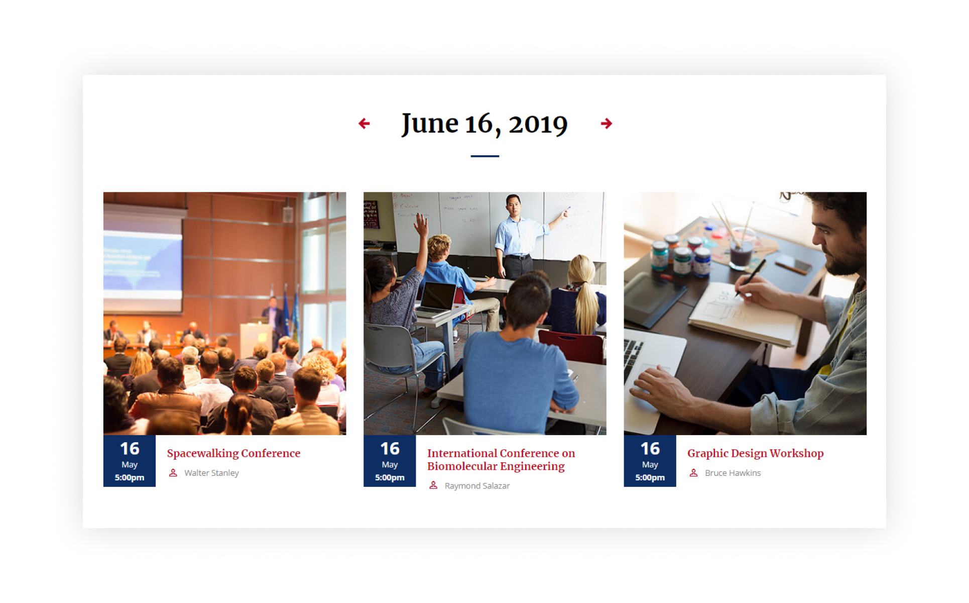 Our template also provides a wide selection of ready-made pages. They are designed for diverse purposes. For example, you can tell the story of your university on the History page. It is also easy to describe various programs on the Academics page. Our solution allows posting news and sharing photos from campus without any troubles. it can be done via News and Gallery pages with different layouts. Also, you can set up an online store and sell clothes and merchandise with the logo of your university. That's what our eCommerce-ready pages of the university responsive HTML5 website template are for.