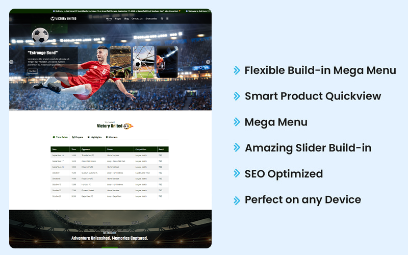 Victory United is a versatile HTML template meticulously crafted to offer seamless customization, making it the perfect choice for Sportswear Stores, Athletic Gear Retailers, Sports Enthusiasts, and Fitness Professionals.