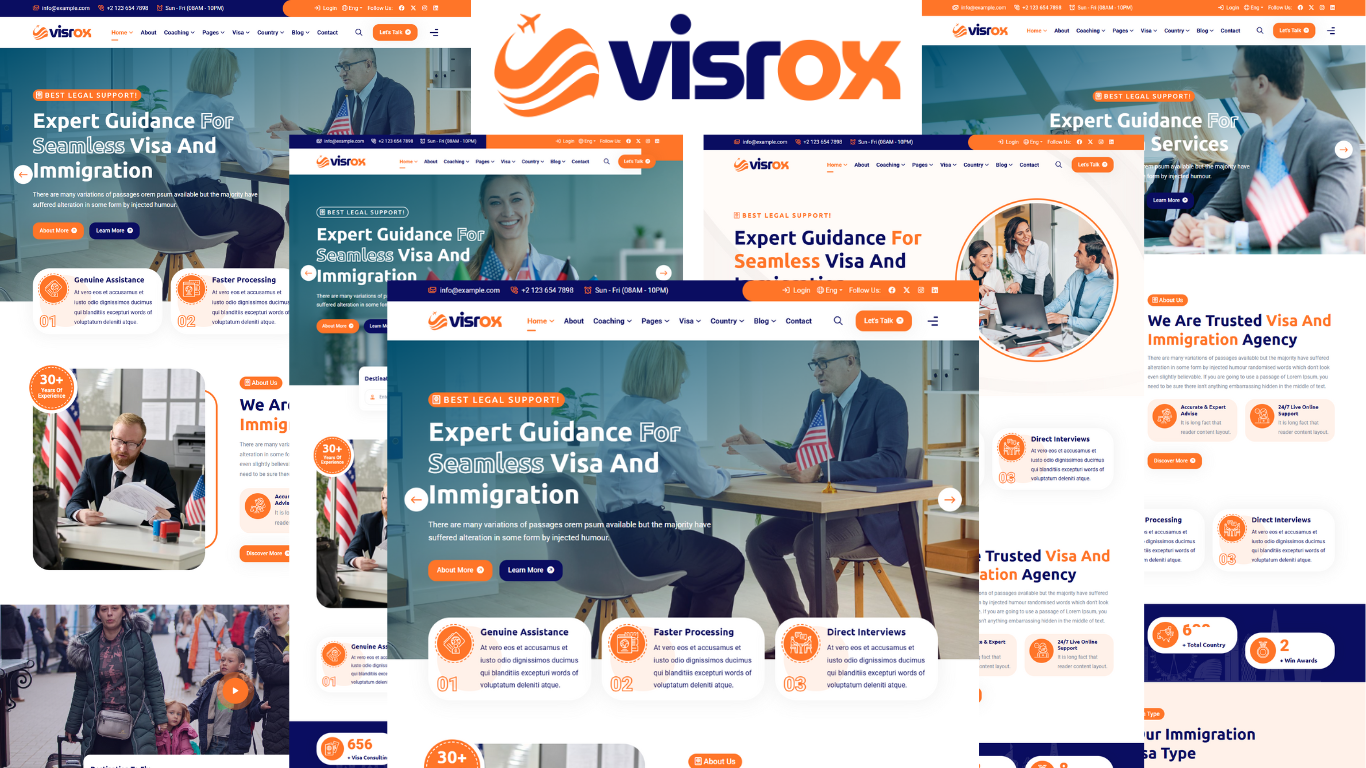Visrox-is an extremely perfect and unique HTML5 Template.Visrox perfectly designed for visa agency, visa consulting, abroad business, immigration agency, migration, travel planner, study visa, tourism and related site.Expand your visa consultancy business with our Visrox an expertly designed, high-performance site template.Visrox is designed to highlight your expertise in the visa application process, offering clear navigation, insightful resources, and an intuitive layout that puts client engagement at the forefront.Built with a clean and professional aesthetic, this template offers a variety of customizable sections.With an intuitive and clean layout, your clients can easily navigate through the website to find the information they need.Boost your internet visibility, gain the audience's trust, and simplify the visa consultation process with a template that works as hard as you do.