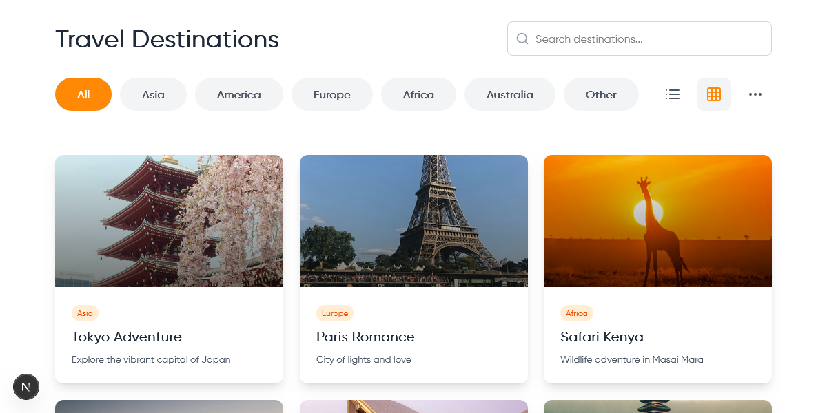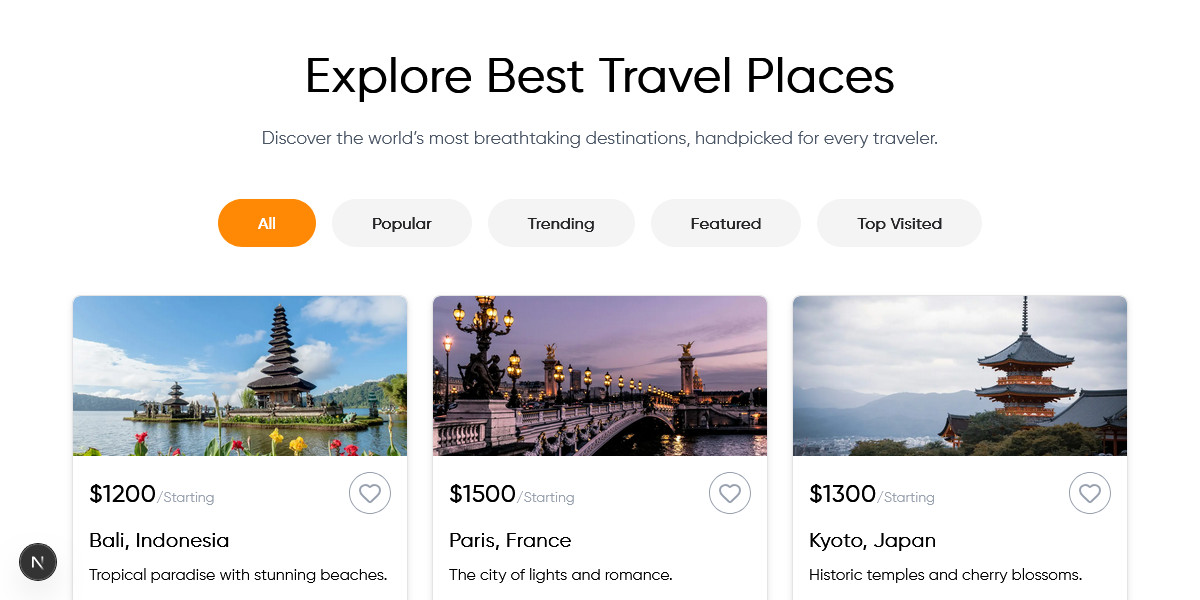 - Comprehensive Destination Management: Includes advanced destination listings with grid and list layouts, individual detail pages, and intelligent category filtering across Asia, Europe, Africa, America, and Australia.