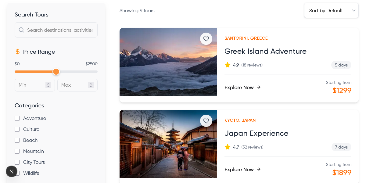 - Advanced Tour & Activity System: Integrates comprehensive tour packages with multiple layouts, detailed information pages, advanced filtering systems, rating displays, and heart icon favorites functionality.