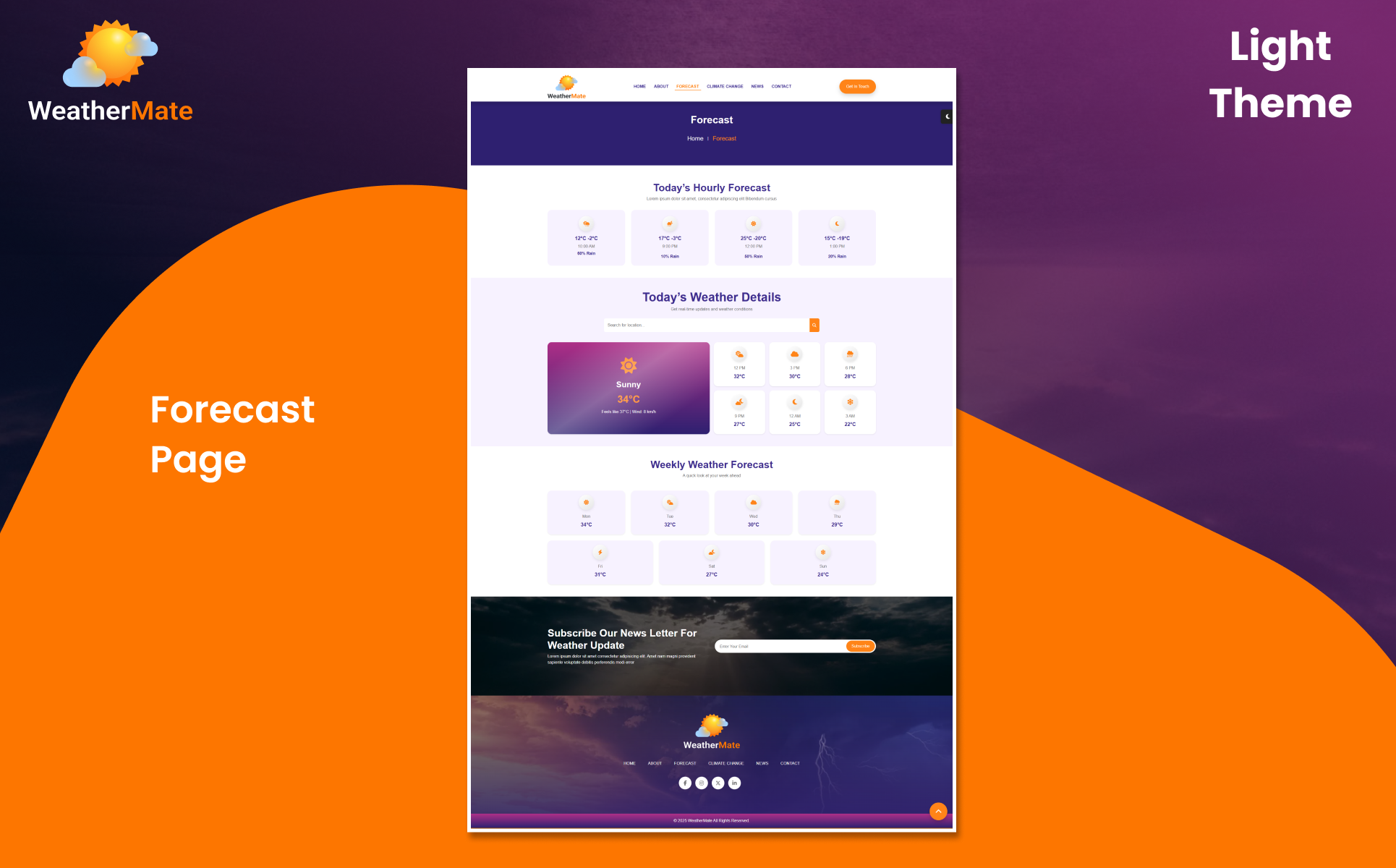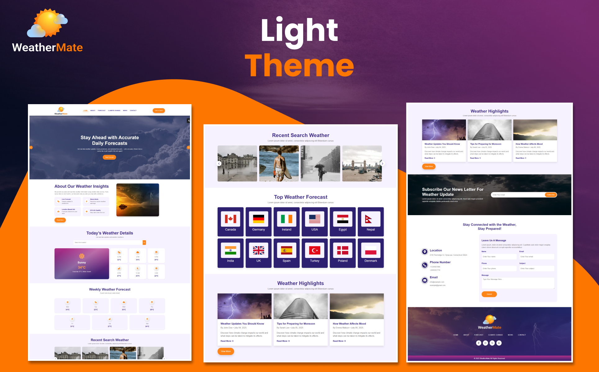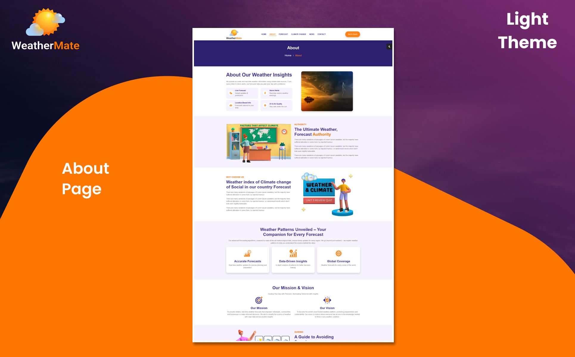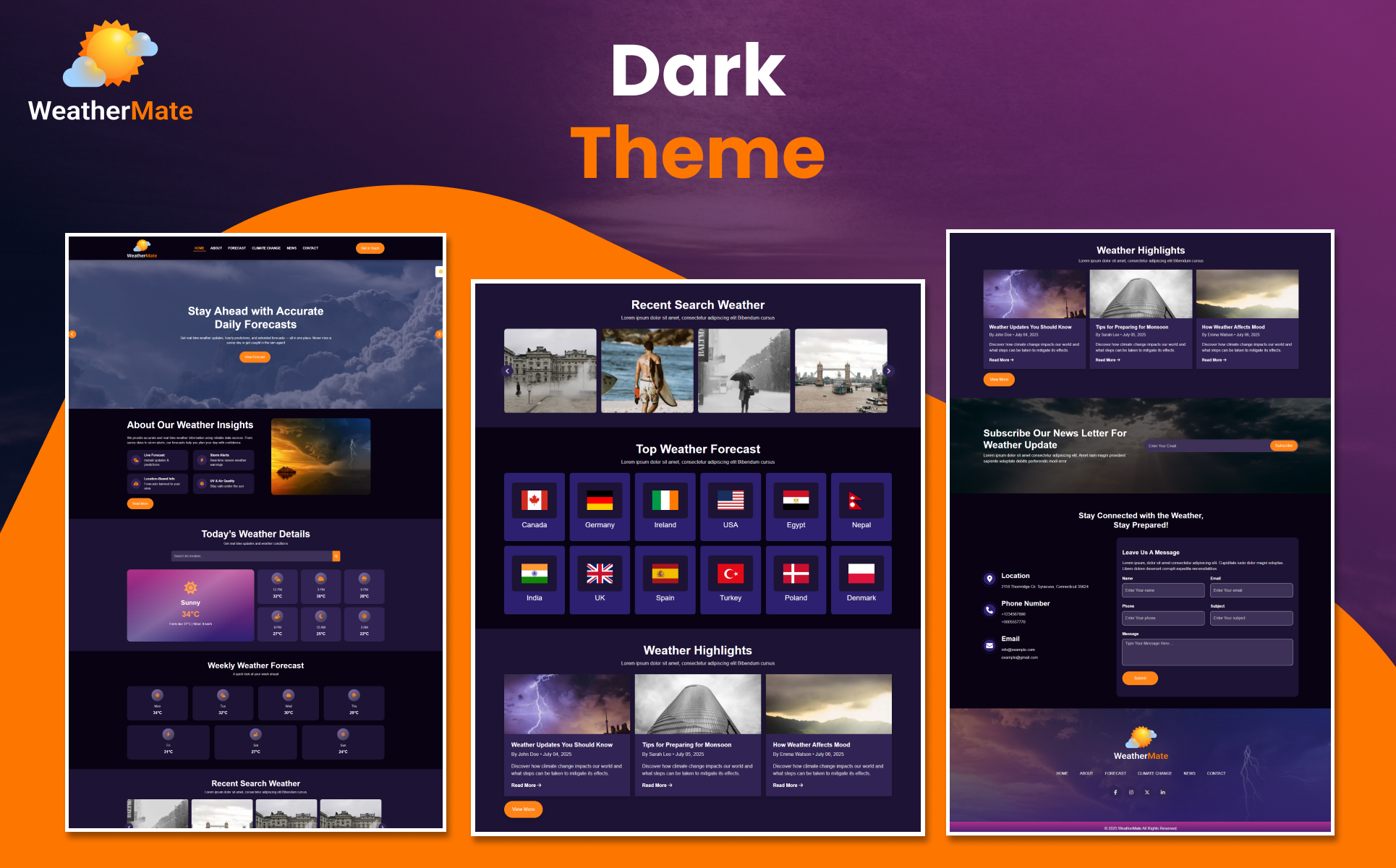WeatherMate is a powerful and visually appealing multipage HTML5 weather forecast website template designed for meteorological services, climate blogs, environmental awareness platforms, and real-time weather dashboards. Built using the robust Bootstrap 5 framework, and developed with HTML5, CSS3, and JavaScript, this template offers a modern UI with a seamless light/dark mode toggle for optimal user experience across all devices.This upgraded multipage version brings better structure, navigation, and dedicated pages for different types of content—from live forecasts and climate data to news articles, galleries, and contact forms. WeatherMate provides a clean, professional, and data-centric layout, enhanced with scroll animations, icons, and responsive design principles.Whether you're building a local weather website, a climate change portal, or a government meteorological site, WeatherMate Multipage Template gives you all the tools to present your content in a clear, engaging, and user-friendly format.