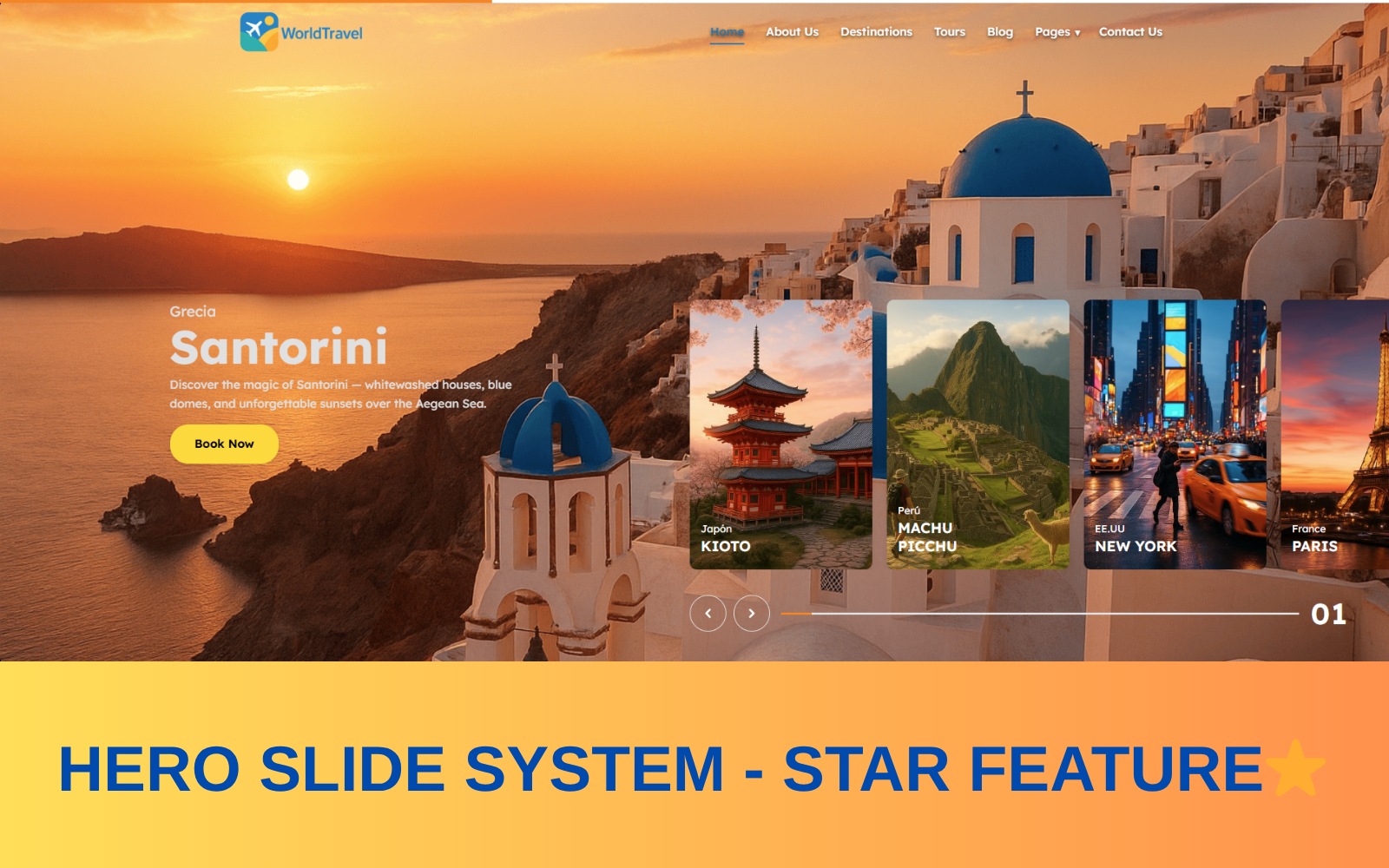 At the heart of WorldTravel is its cutting-edge Data JS-Powered Hero Slide System. This standout feature cements its reputation as a genuinely contemporary travel website template, enabling you to seamlessly update featured destinations from a single data file for an engaging, full-screen presentation. It’s crafted to transform visitors into clients, positioning it as more than just a typical tour and travel website template; it’s a dynamic platform to propel your business forward. This is the tour and travel website template designed to elevate your brand and effectively promote your unique offerings. Whether you’re a large corporation or a solo entrepreneur in need of a professional travel agent website template, WorldTravel serves as your foundation for growth and exploration.