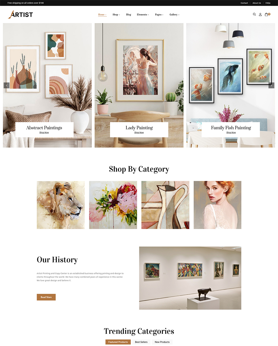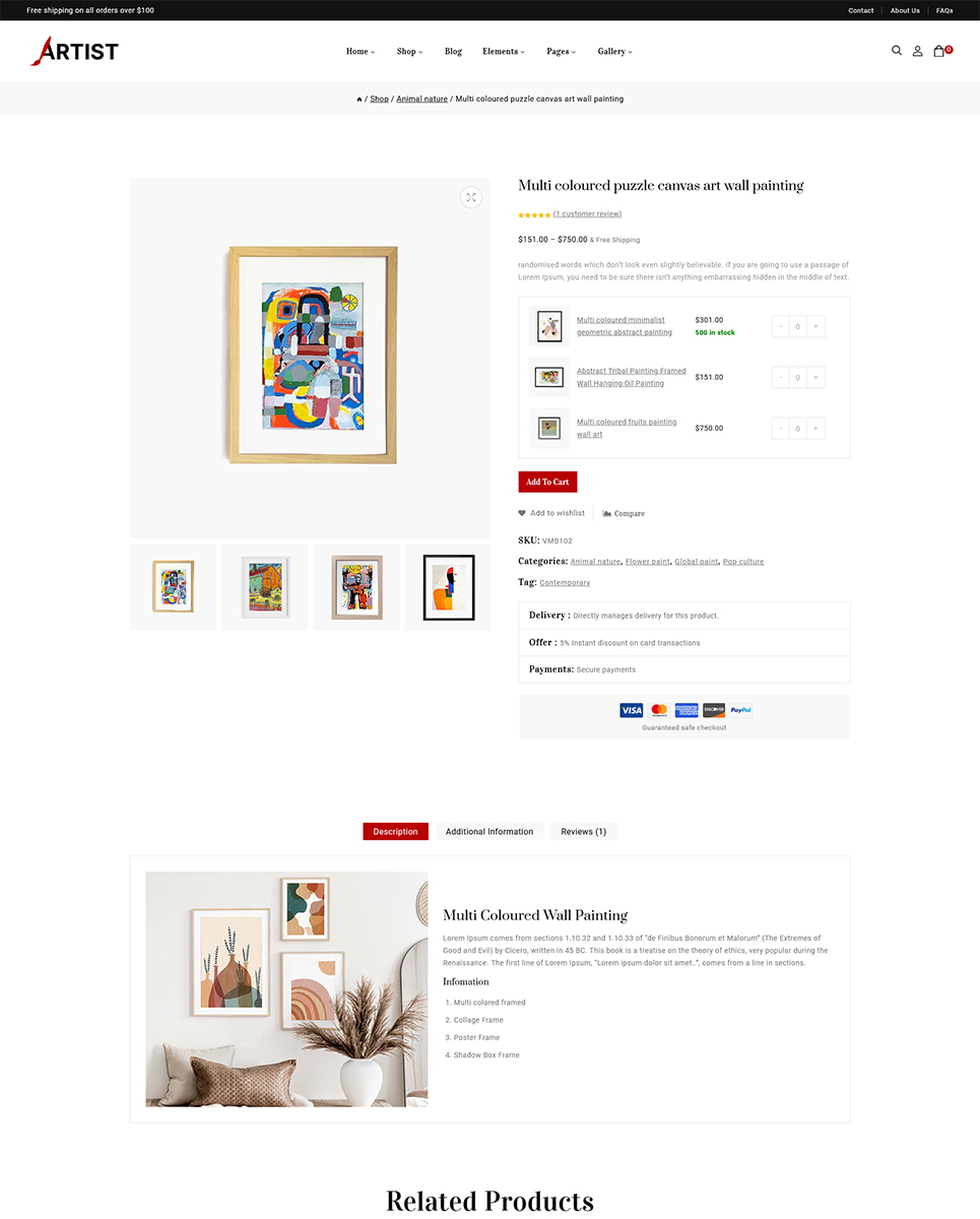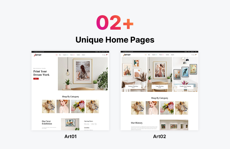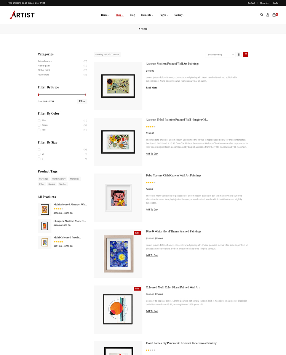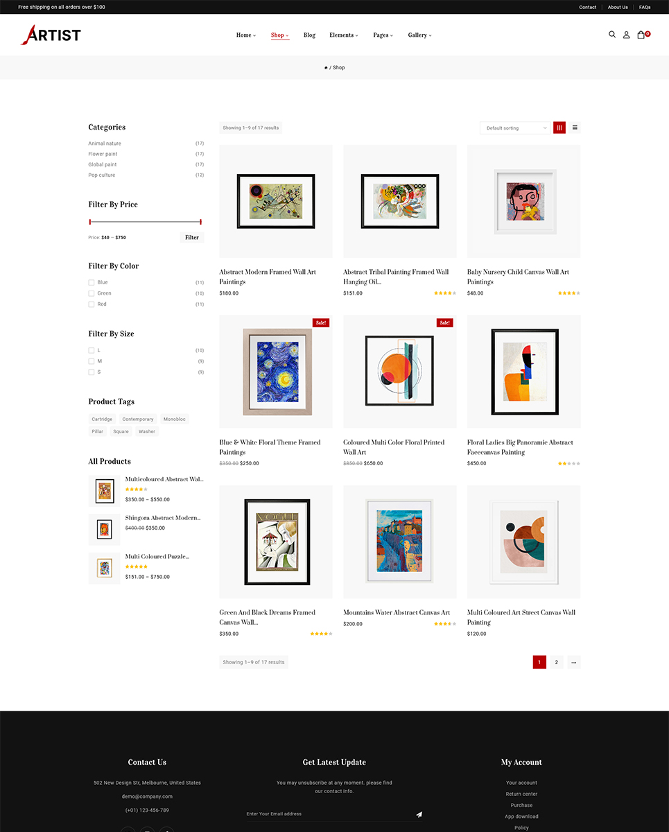 Artist - Art and Gallery Multipurpose Responsive Elementor WooCommerce Theme is a very unique concept for the painting, poster, gallery, book, magazine, decor-items store, canvas painting, sketch, oil painting, art, abstract design, banner, brochure, booklet, stickers, sheet, exhibition, portfolio, and other Multi-Purpose stores. Especially focus on clean design.