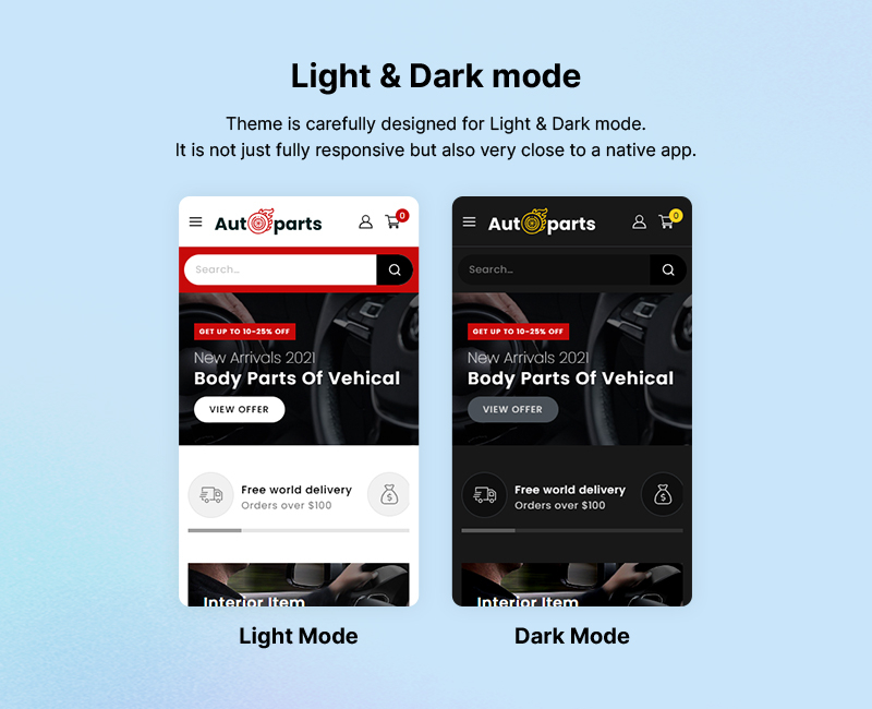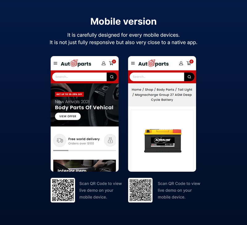 Let grab the Autoparts theme and have an interesting experience with it! Autoparts - WooCommerce Store - is a powerful e-commerce tool to create a personal webshop. Using our theme, you can see your pages automatically look great on every device, so you can reach more potential customers from mobile, tablet, or desktop.