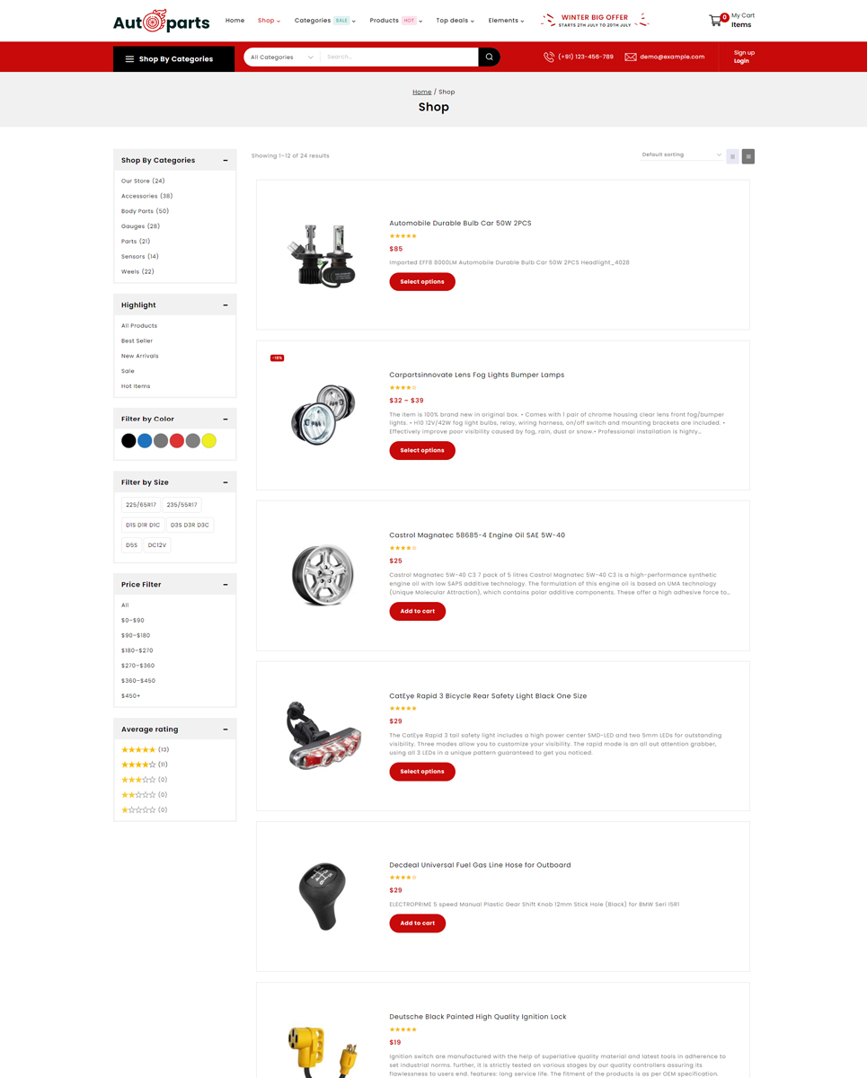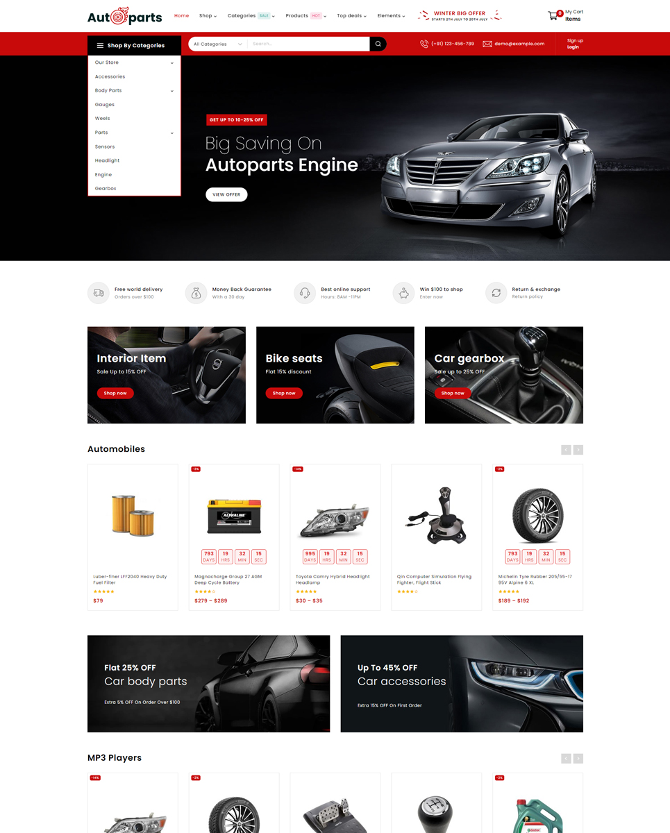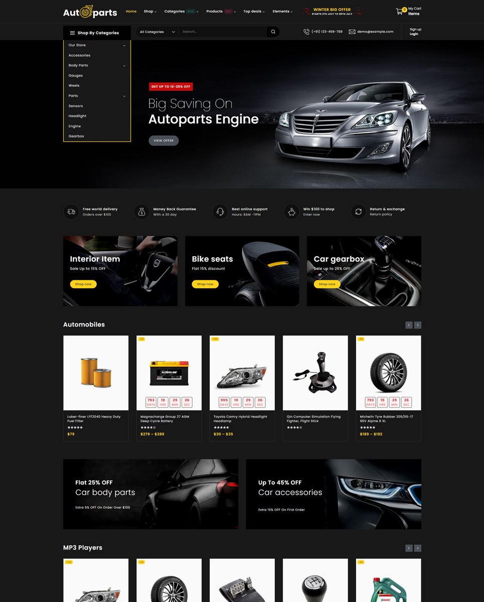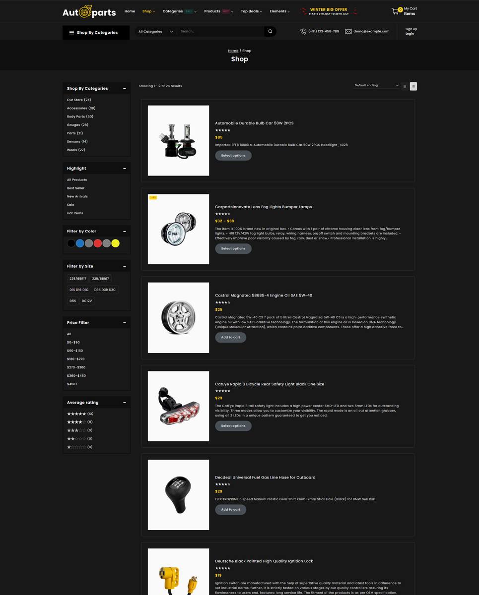 Autoparts - Mega Shop Multipurpose Responsive WooCommerce Store is the stunning store for any auto parts, auto equipment, Spare Parts, Cars, Tools, Accessories, or any online shopping stores: Cars & Motorcycles, Car Templates, Car Repair Templates, Car Dealer Templates, Auto Parts Templates, Wheels & Tires Templates, Electronics Templates, Car Templates, Car Dealer Templates, Auto Parts Templates. Autopart store design with WP-Bakery plugin, supports WPML, MailChimp, Revolution Slider, and Easy 1-Click Demo Import. It is looking good with its colors combination.