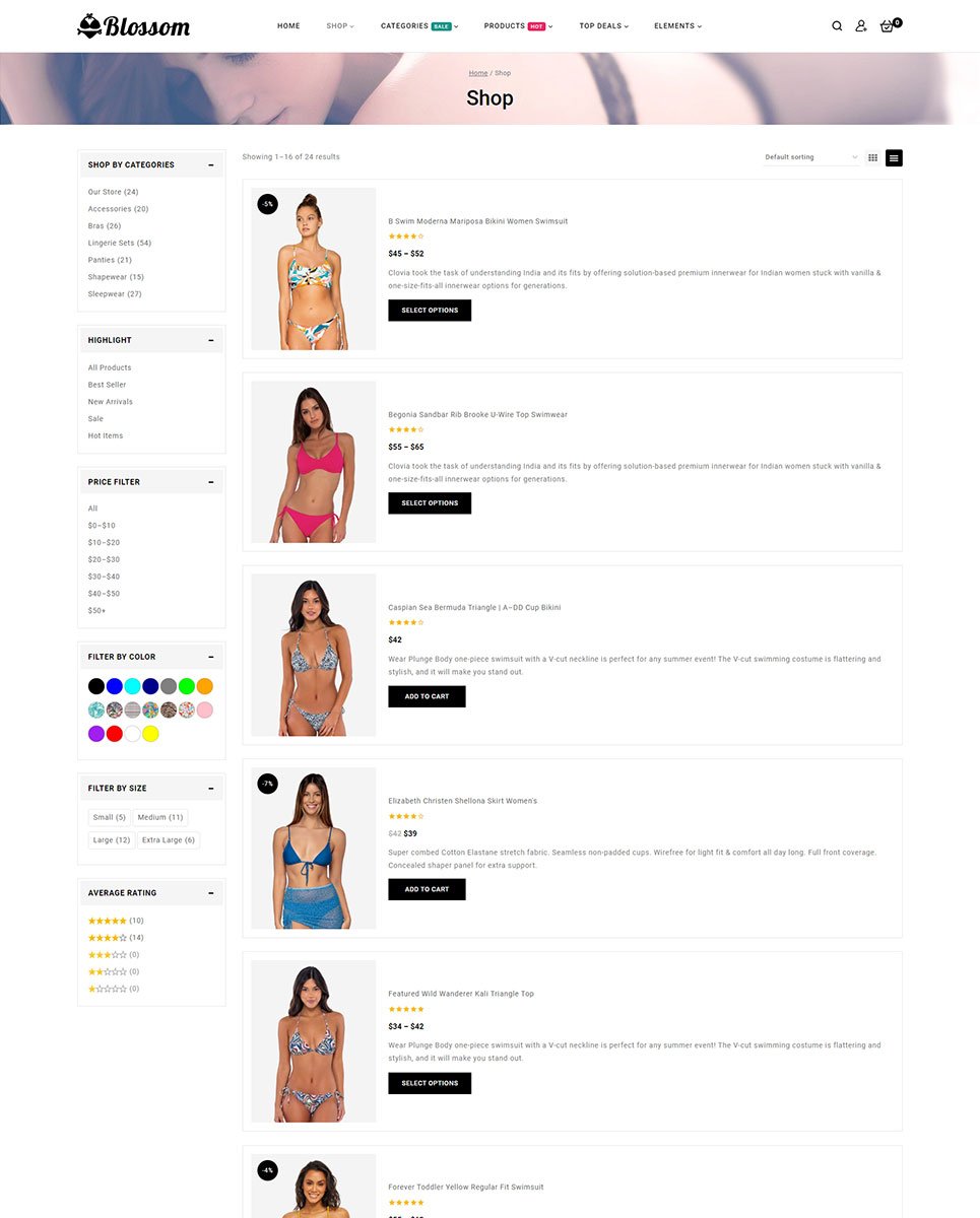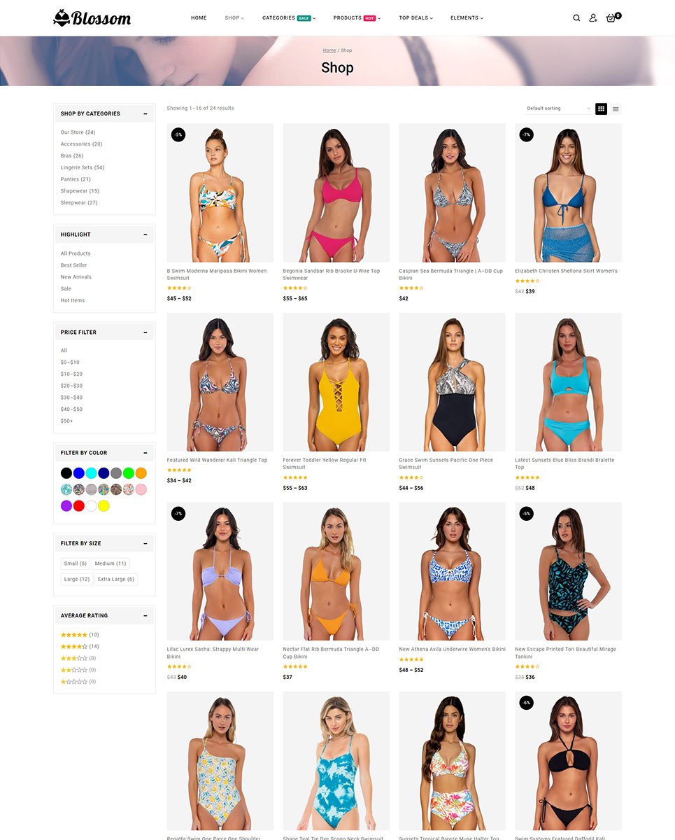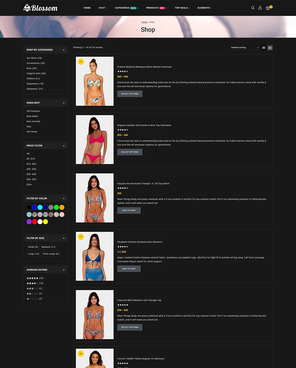 Blossom incorporates Ajax technology to enhance user experience by enabling seamless and dynamic loading of content, ensuring faster page transitions and smoother interactions. With Ajax filter functionality, customers can easily refine their product search based on various criteria such as size, color, price range, and more, without having to reload the page. The inclusion of Revolution Slider allows you to create captivating slideshows and presentations, showcasing your lingerie collection in an engaging and visually appealing manner.
