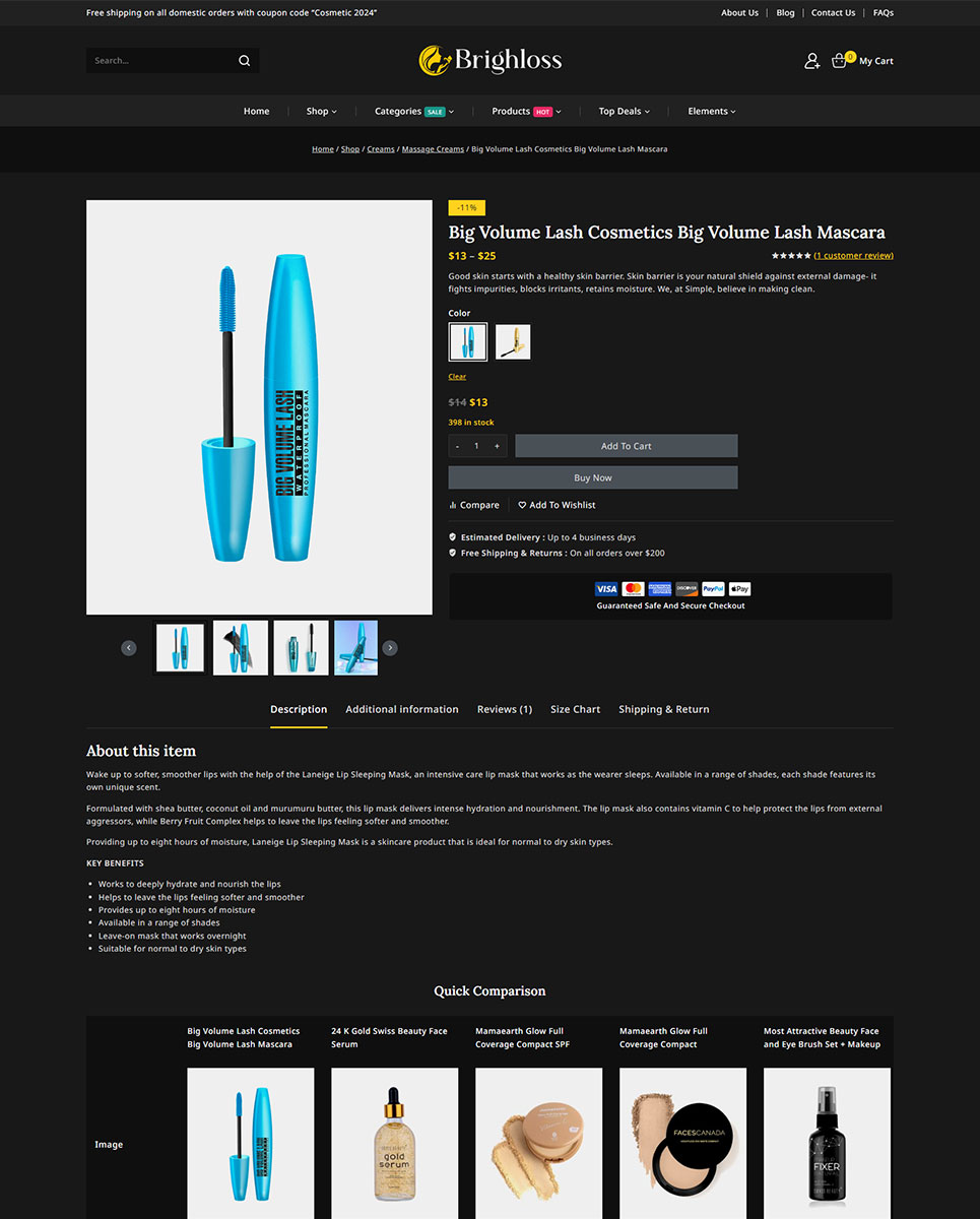 Brighloss is fully responsive and mobile-ready, ensuring that your website looks flawless whether accessed from a desktop, tablet, or smartphone. Get started quickly with the one-click import feature, allowing you to replicate the demo content effortlessly. Launch your online beauty and cosmetic store in no time and start attracting customers from around the globe.