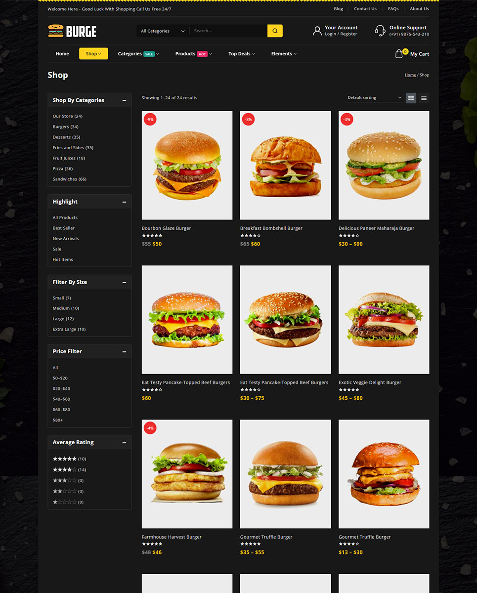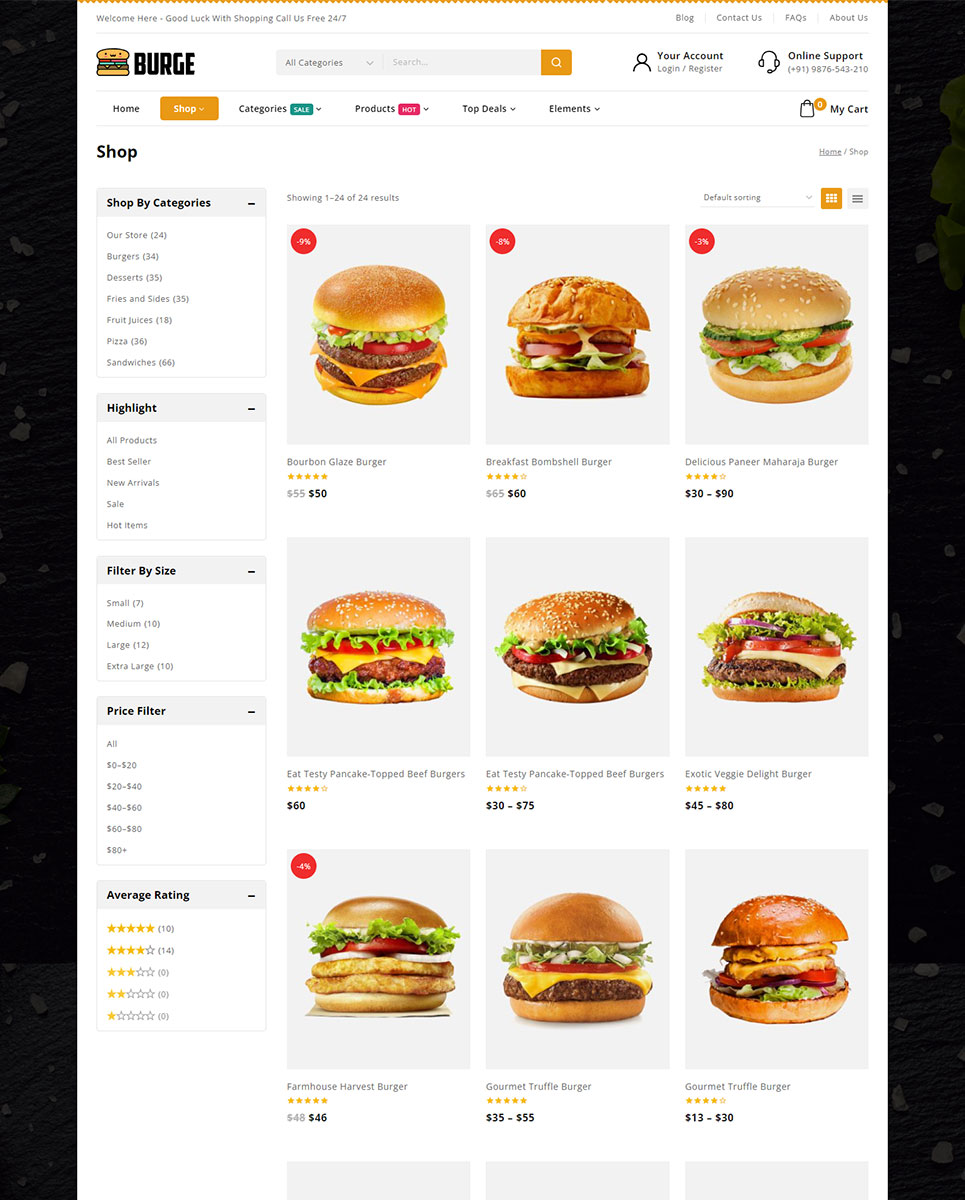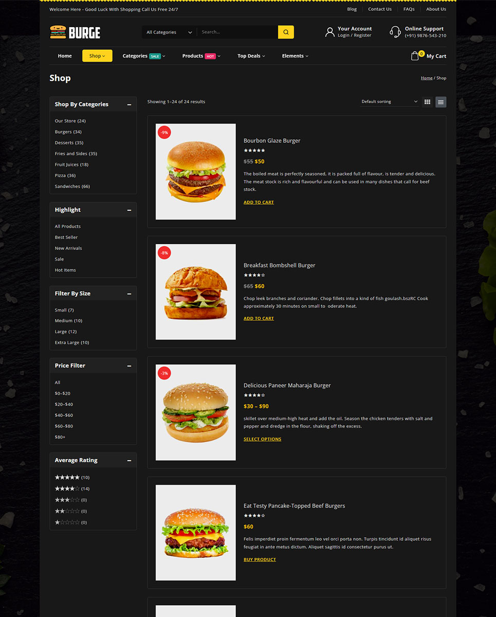 Burge is a carefully crafted WordPress theme designed specifically for fast food stores, burger, pizza, spice, sweet, snacks, coffee, cafe and restaurant shop with seamlessly integrating Elementor and WooCommerce. With a focus on delicious design and seamless functionality, Burge provides a comprehensive platform to showcase and sell mouthwatering fast food items. Burge offers a box layout option, adding a modern and visually appealing touch to your fast food store. This layout option provides a clean and organized display of your menu items, ensuring that visitors can easily browse and select their favorite treats.
