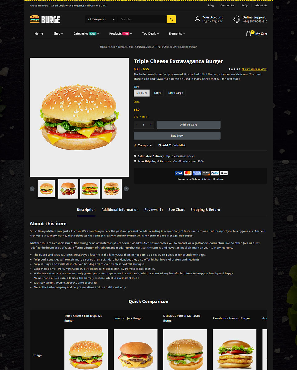 Simplify navigation and showcase your product categories effectively with Burge's Mega Menu feature. Categorize your fast food offerings for a user-friendly browsing experience that enhances discoverability and engagement. Organize your extensive menu effortlessly with Burge's Product Tabs feature. Elevate user experience with Burge' Ajax Filter feature. Enable customers to refine their searches seamlessly based on specific criteria such as brand, features, or price range, ensuring they find the perfect timepiece quickly and efficiently.