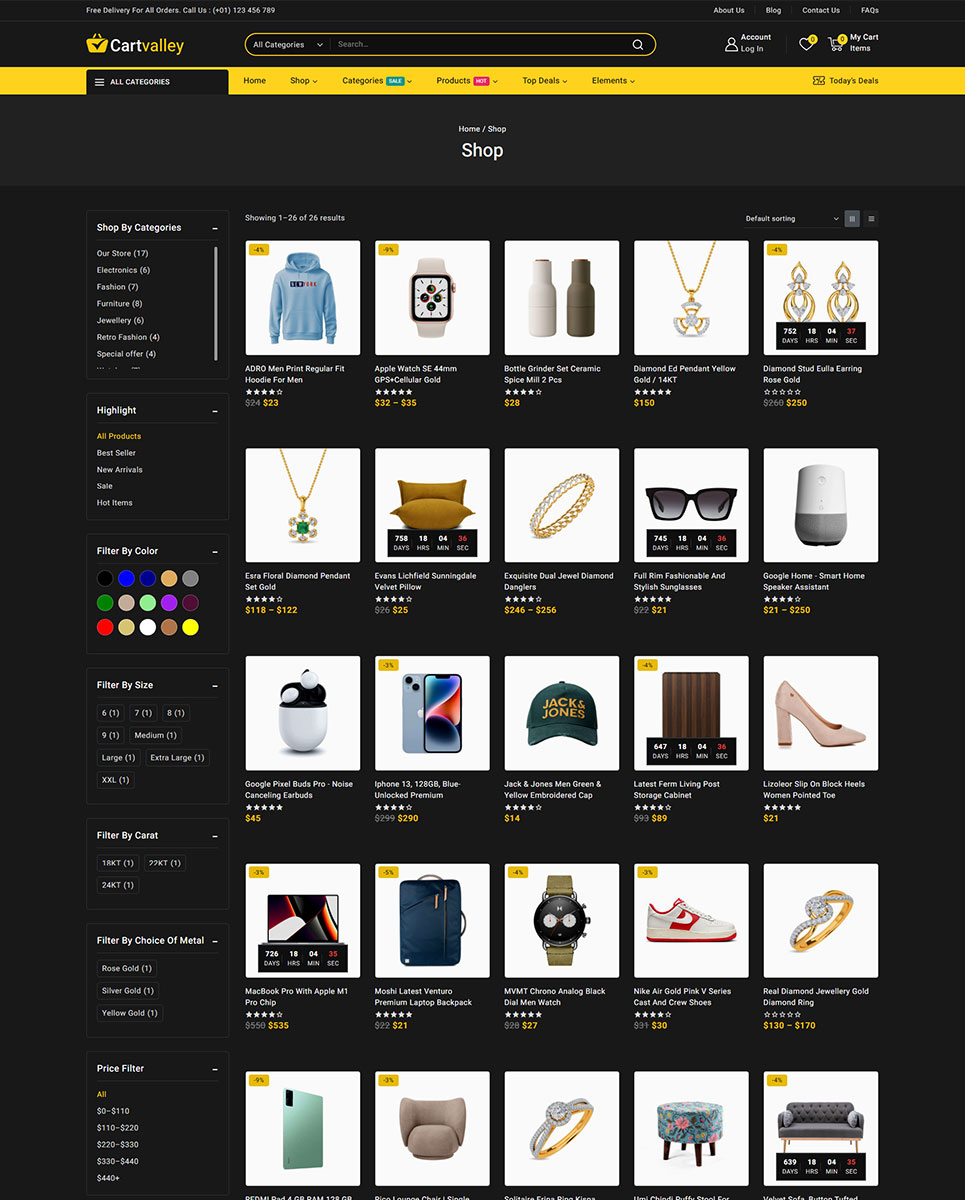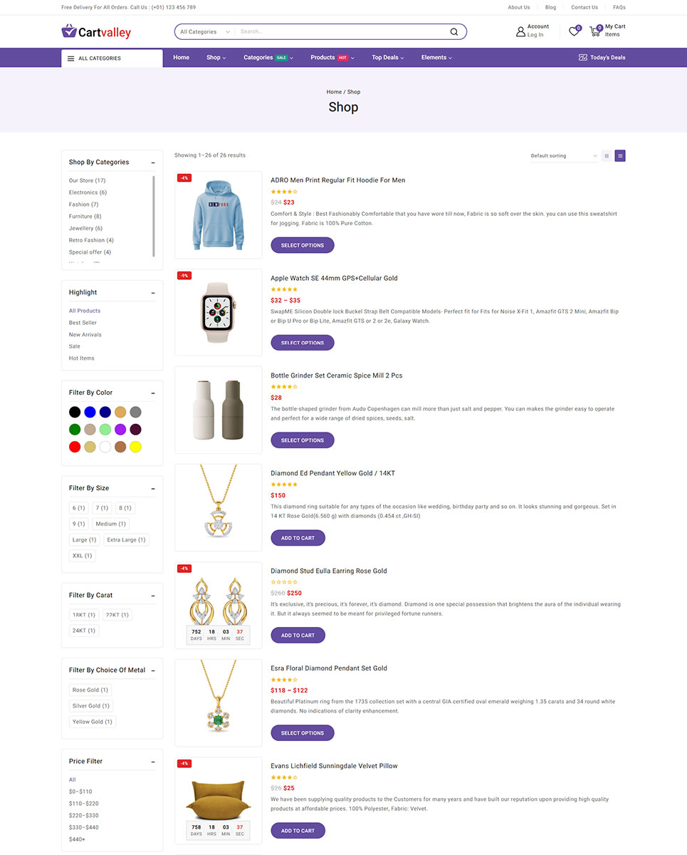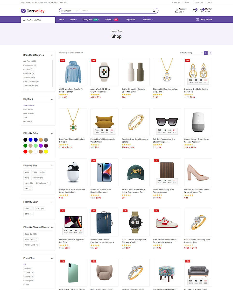 Cartvalley is a versatile and feature-rich Elementor WooCommerce theme designed to cater to a wide range of online stores. Whether you're running a fashion boutique, electronics shop, furniture store, or any other e-commerce business, Cartvalley provides a modern, responsive, and fully customizable platform to showcase your products and deliver an exceptional shopping experience.