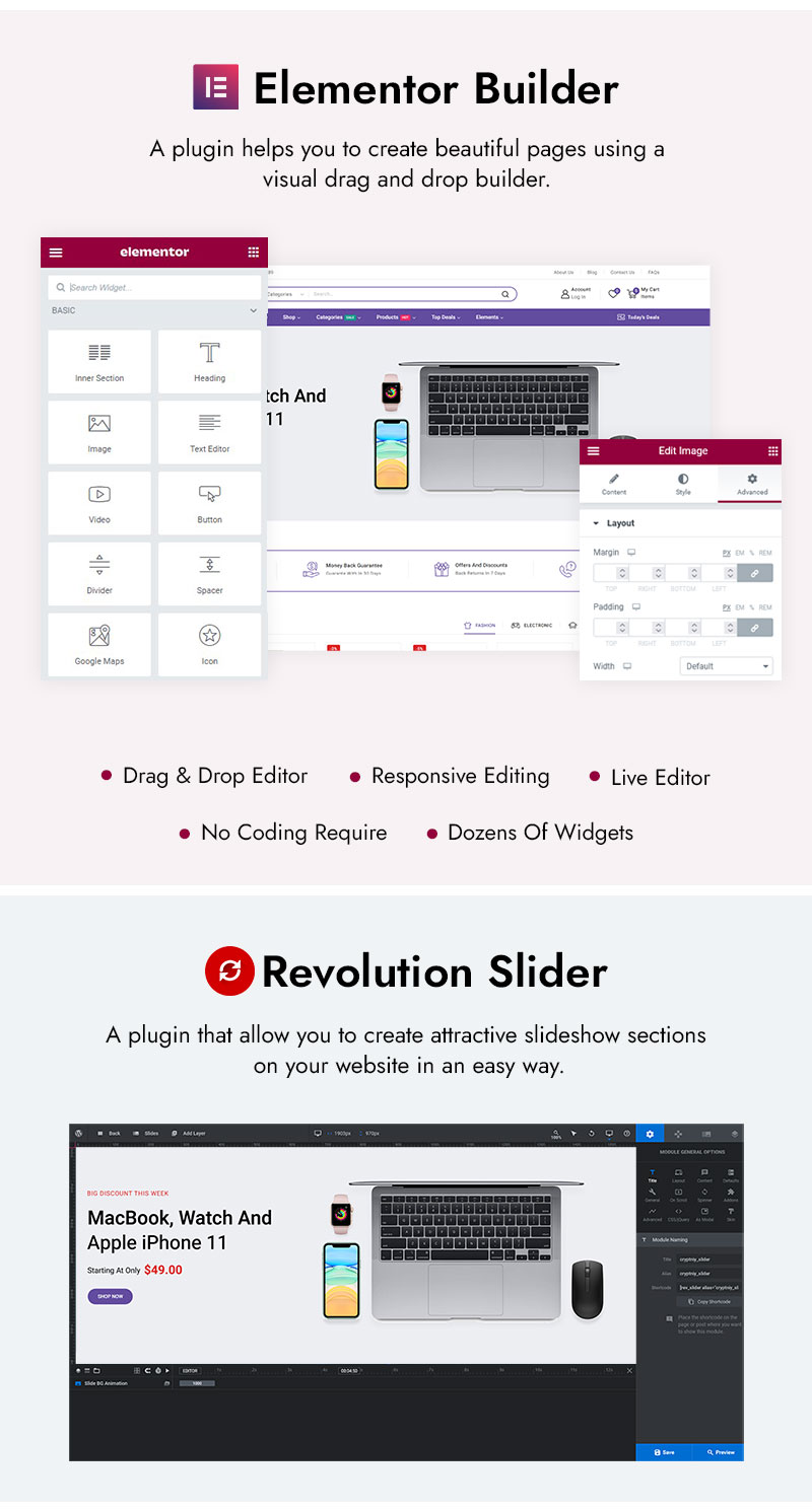 Cartvalley is built to suit a variety of industries and niches. Its flexible and dynamic layout ensures it can be tailored to meet the unique needs of your business, whether you're selling clothing, electronics, home decor, or beauty products. Empower yourself with the intuitive drag-and-drop Elementor page builder. Customize your website effortlessly, from layout changes to designing stunning pages, all without touching a line of code.