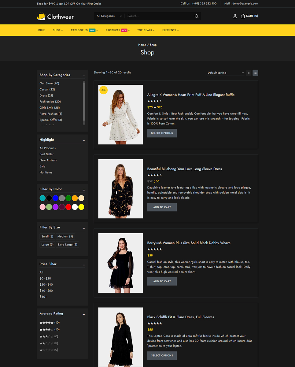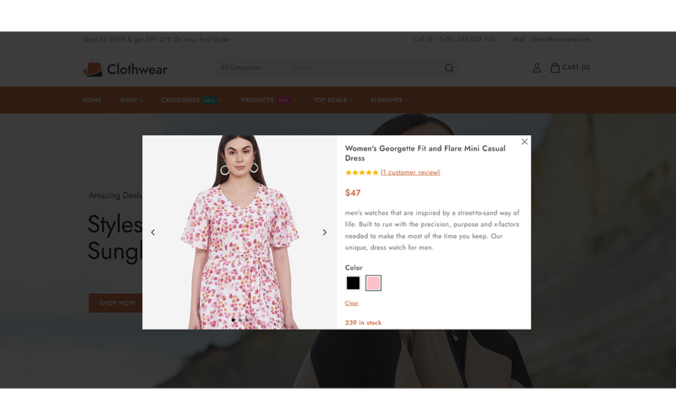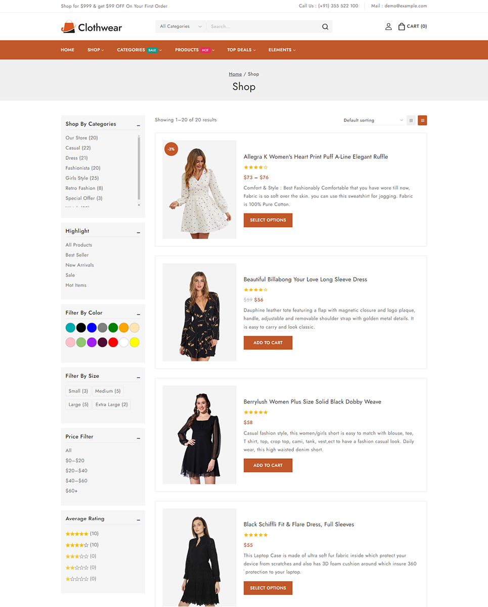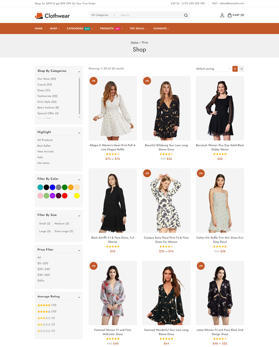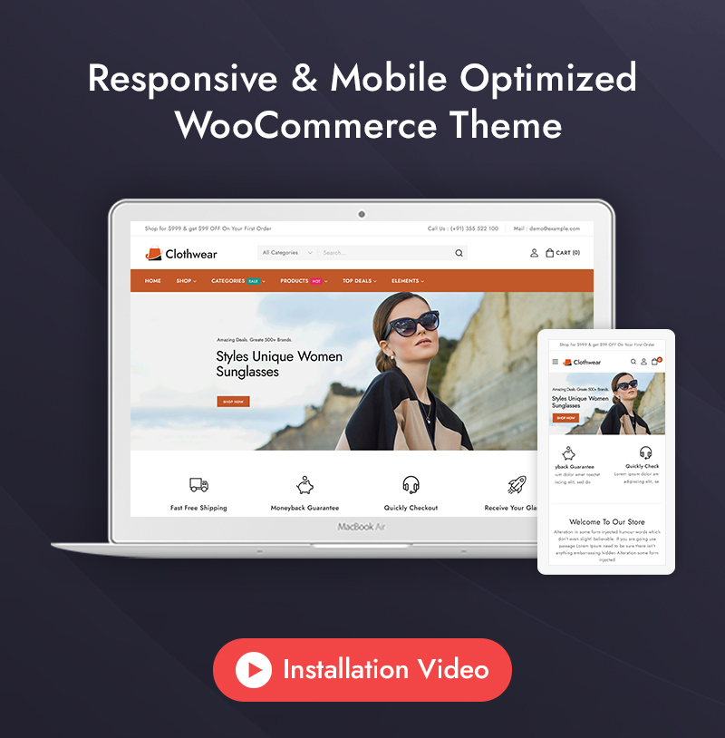 Welcome to Clothwear, the premier Elementor WooCommerce responsive theme designed exclusively for women’s fashion stores. Whether you're curating chic everyday wear, elegant evening gowns, or trendy accessories, Clothwear provides the perfect platform to showcase your stylish collections with flair and sophistication. Clothwear features an elegant, modern design that perfectly captures the essence of contemporary women’s fashion. Whether you’re showcasing casual wear, formal dresses, or accessories, Clothwear offers dedicated layouts that highlight your products in the best possible way.