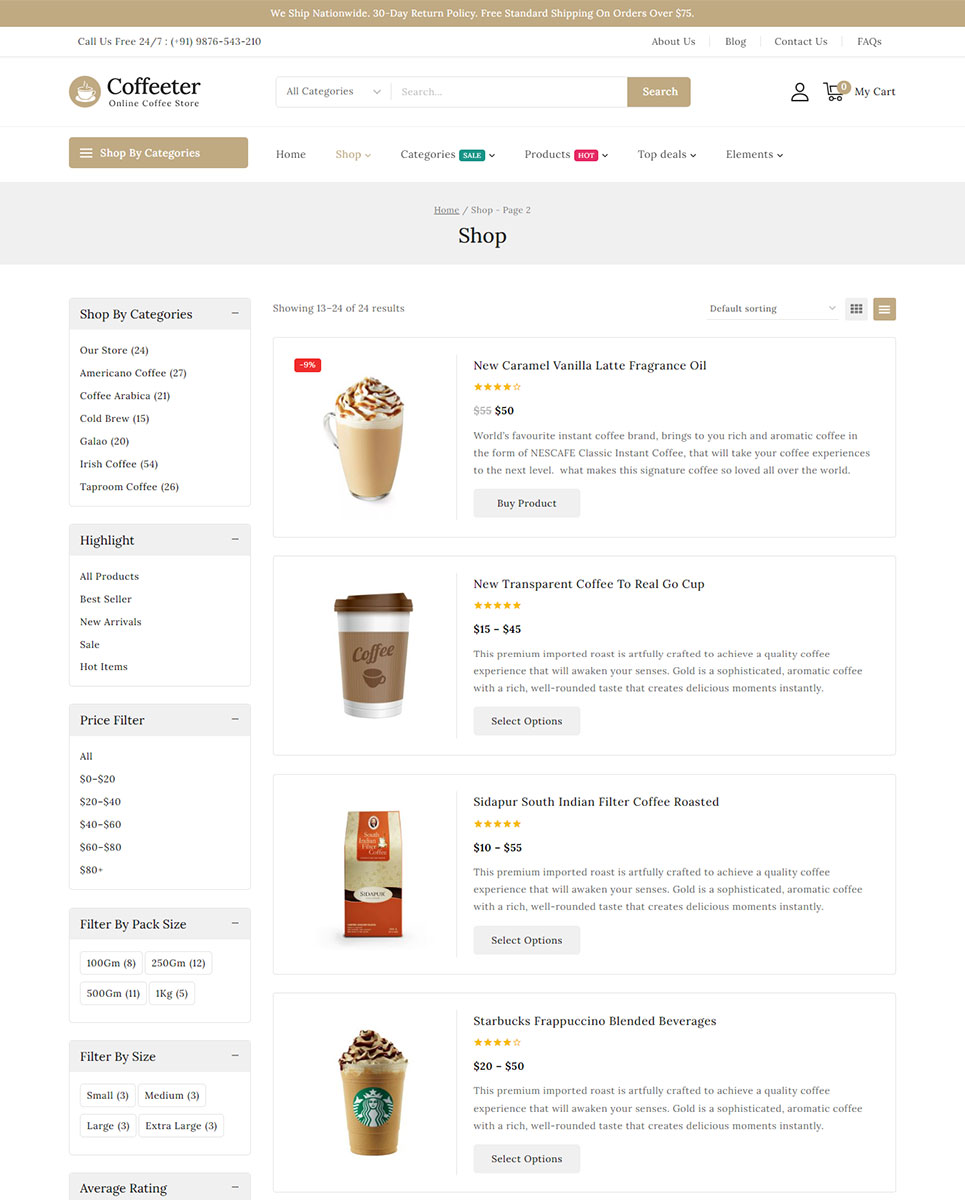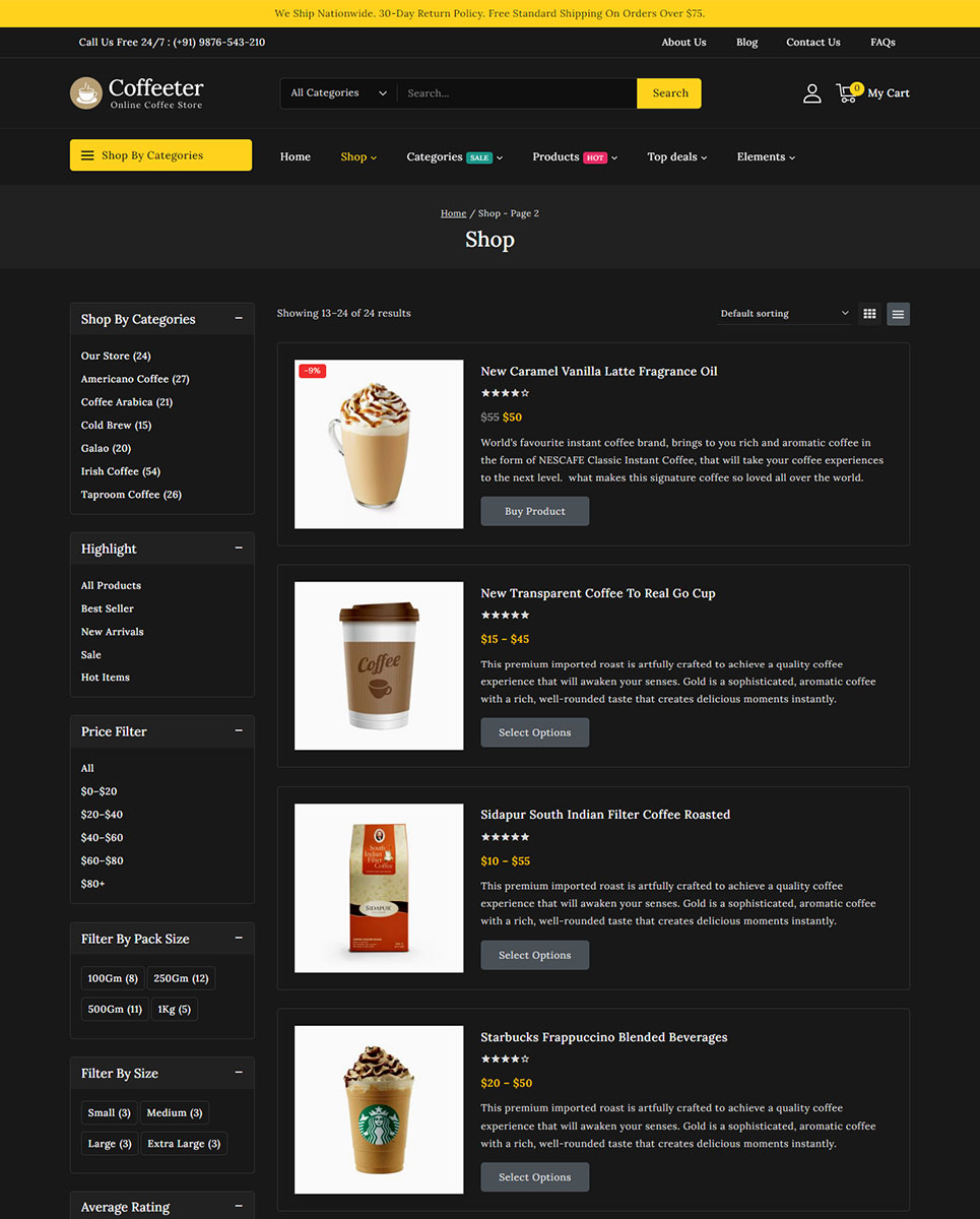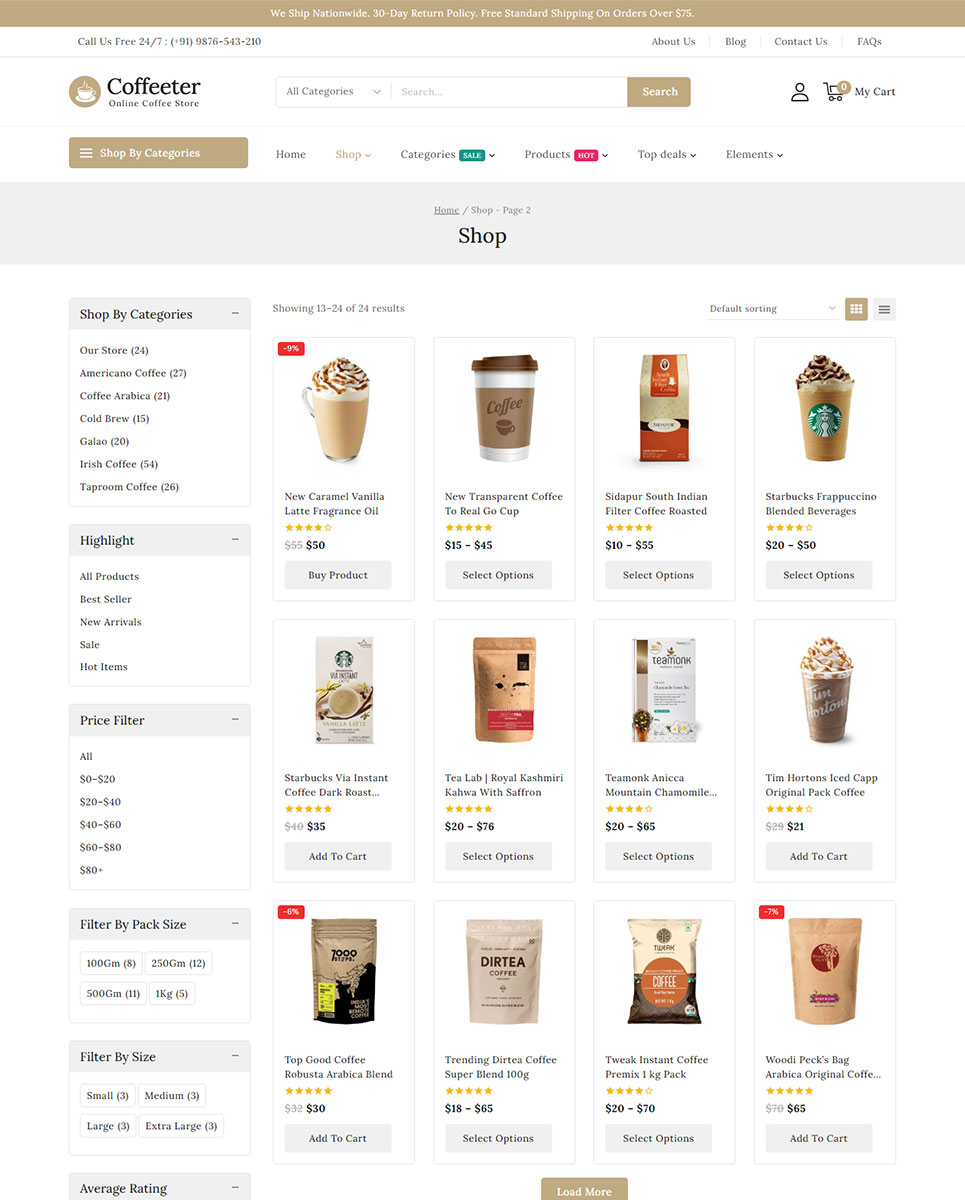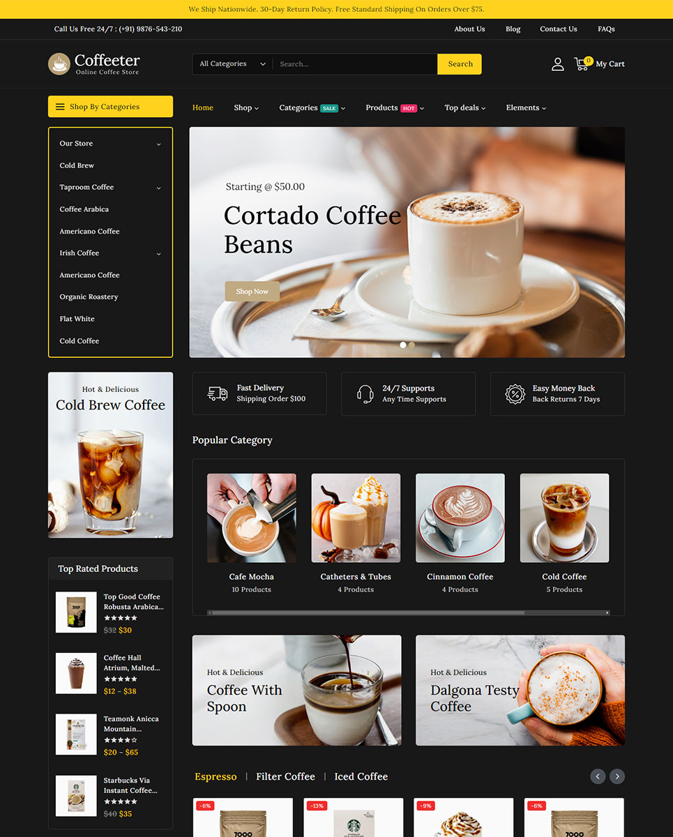 "Coffeeter - Best Coffee Store," is an elegant and appealing WooCommerce WordPress Theme where the rich aroma of freshly brewed possibilities meets the modern world of online commerce. Theme suitable for businesses such as Coffee, Cafe, Bakery, Cake, Chocolate, Grocery, Organic, Fruits, Vegetable Food and Drink. This Elementor WooCommerce Responsive Theme is a celebration of all things coffee, meticulously designed to provide a seamless and delightful shopping experience for coffee enthusiasts. This WooCommerce theme has 1-Click Import, Responsive Layout, Wishlist & Compare, Quick View, Ajax Cart, Shop By Category, Product Tab, and more features.
