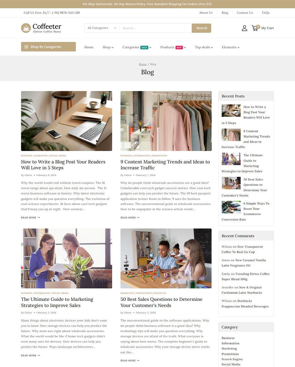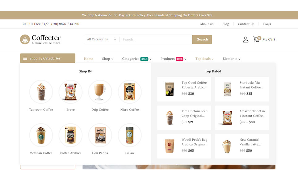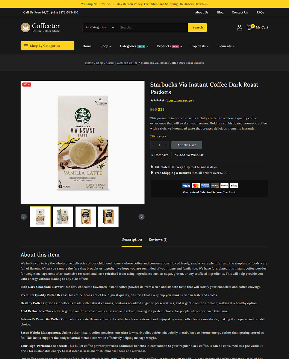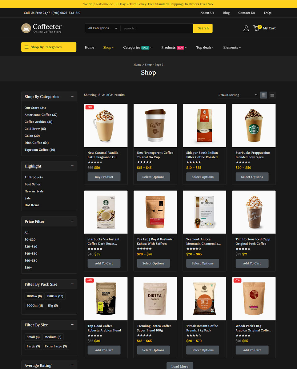 "Coffeeter - Best Coffee Store," is an elegant and appealing WooCommerce WordPress Theme where the rich aroma of freshly brewed possibilities meets the modern world of online commerce. Theme suitable for businesses such as Coffee, Cafe, Bakery, Cake, Chocolate, Grocery, Organic, Fruits, Vegetable Food and Drink. This Elementor WooCommerce Responsive Theme is a celebration of all things coffee, meticulously designed to provide a seamless and delightful shopping experience for coffee enthusiasts. This WooCommerce theme has 1-Click Import, Responsive Layout, Wishlist & Compare, Quick View, Ajax Cart, Shop By Category, Product Tab, and more features.