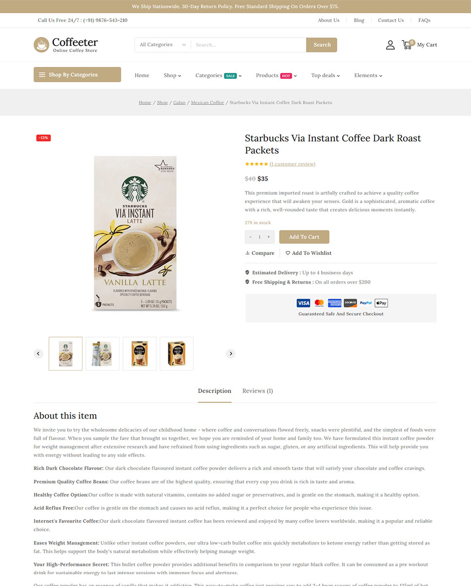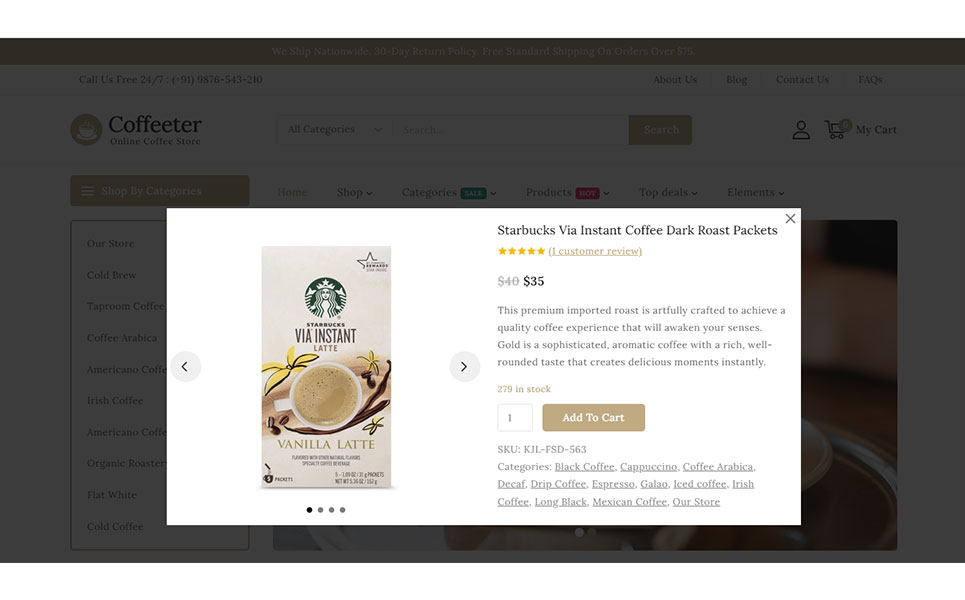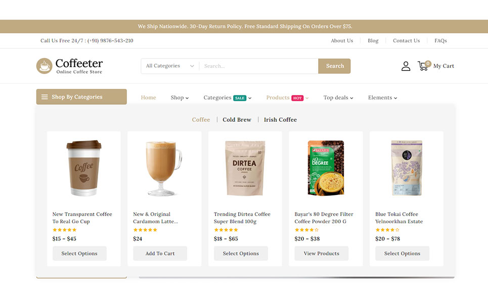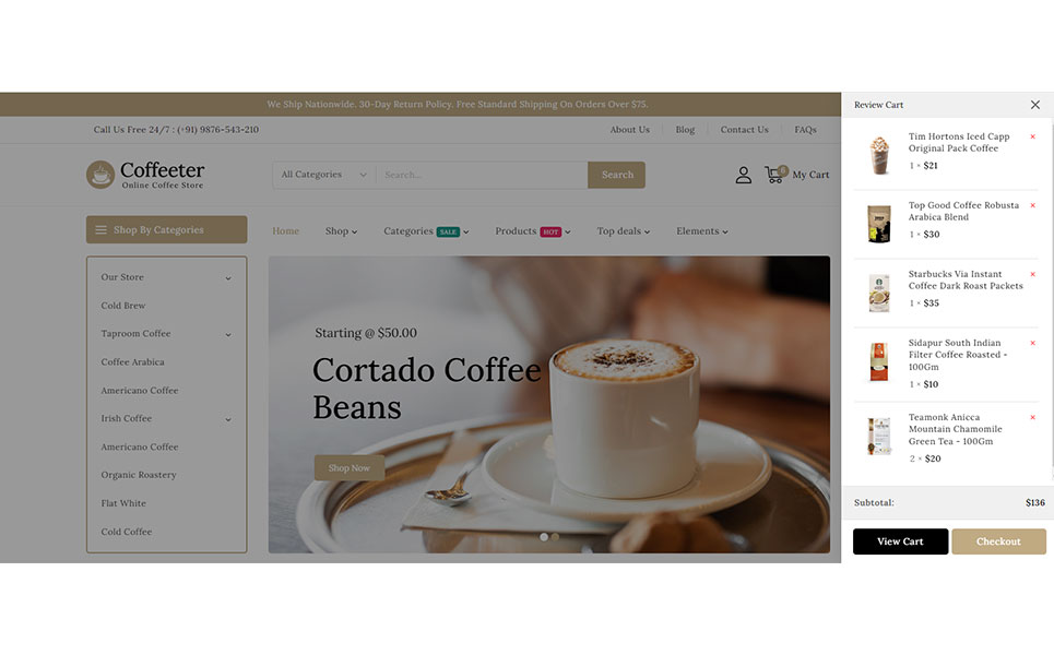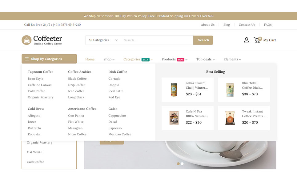 Tailor your website to perfection with the Theme Customizer Option. Adjust colors, fonts, layouts, and more in real-time, ensuring that your coffee store resonates with your brand identity and captivates your audience. Navigate the world of coffee effortlessly with the "Shop by Category" feature. Whether your customers are seeking aromatic beans, brewing accessories, or stylish mugs and other items. Coffeeter's vertical menu design adds a touch of elegance and functionality to your online store. Easily accessible from any page, this menu allows customers to explore different sections seamlessly, enhancing overall navigation. Also, Present your coffee products in a clean and organized manner with the Product Tab feature.