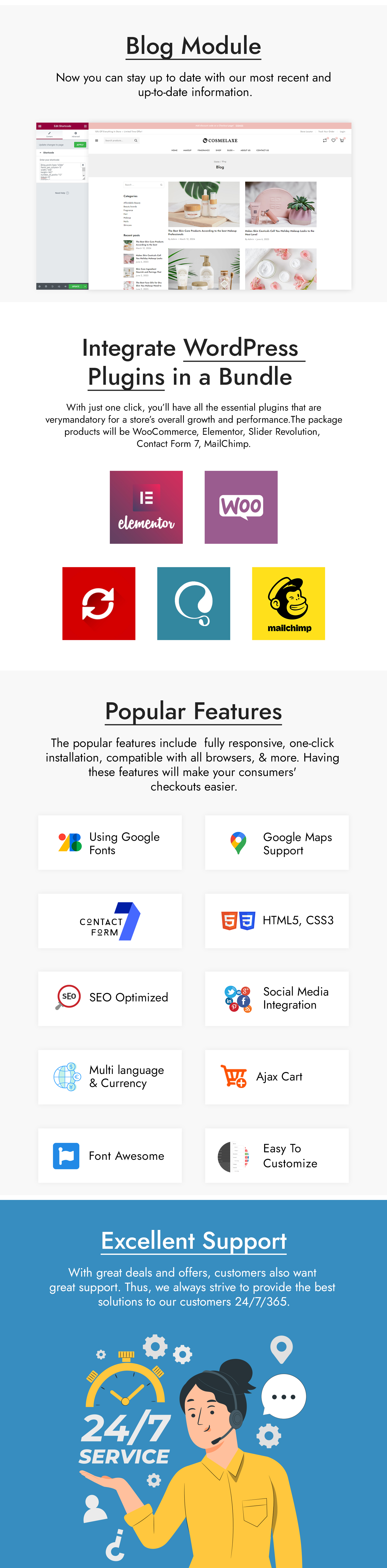 Use our gorgeous Cosmelaxe WooCommerce Theme to completely revamp your beauty and cosmetics store. This theme, which was created with the business sector in mind, skillfully integrates style and usefulness to improve your digital exposure. Its elegant appearance and user-friendly functions let you to easily showcase everything you sell, from beauty essentials to skincare essentials. With capabilities for order processing, management of stocks, and more, WooCommerce makes managing your store easy. There are lots of customization options that make it simple to represent your business identity. The user interface is improved by responsive design, which guarantees compatibility across all devices. With our Cosmelaxe Beauty & Cosmetics Store WooCommerce Theme, you may grow your online beauty business and draw in more clients.